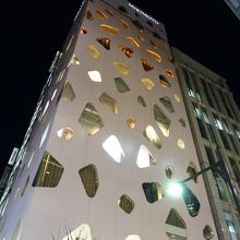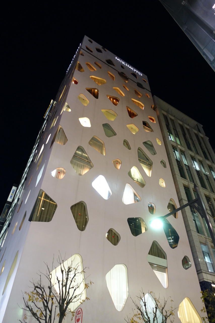晴海通りから並木通りに入り、北方向に2~3分歩くと、右側にとても目立つ奇抜なのっぽビルが現れます。こちらは「ミキモトギンザ2」ビルで、下層階にはミキモトですが、高層階は飲食店が入居しています。ワンフロアの面積は狭いですが、大変ユニークな外観で、周囲から際立っています。高層階のレストランは名店揃いなのもさすがだと思います。