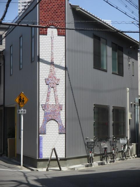 環状線の福島駅からも、このあみだ池筋は続いています。大阪の大動脈という感じで、景観的にはイマイチです。ただひたすら歩いても楽しい道ではありません。自動車で通る道ですが、時間帯によってはラッシュに巻き込まれます。唯一横道で見つけた東京タワーのようなモザイクがある壁は見物でした。