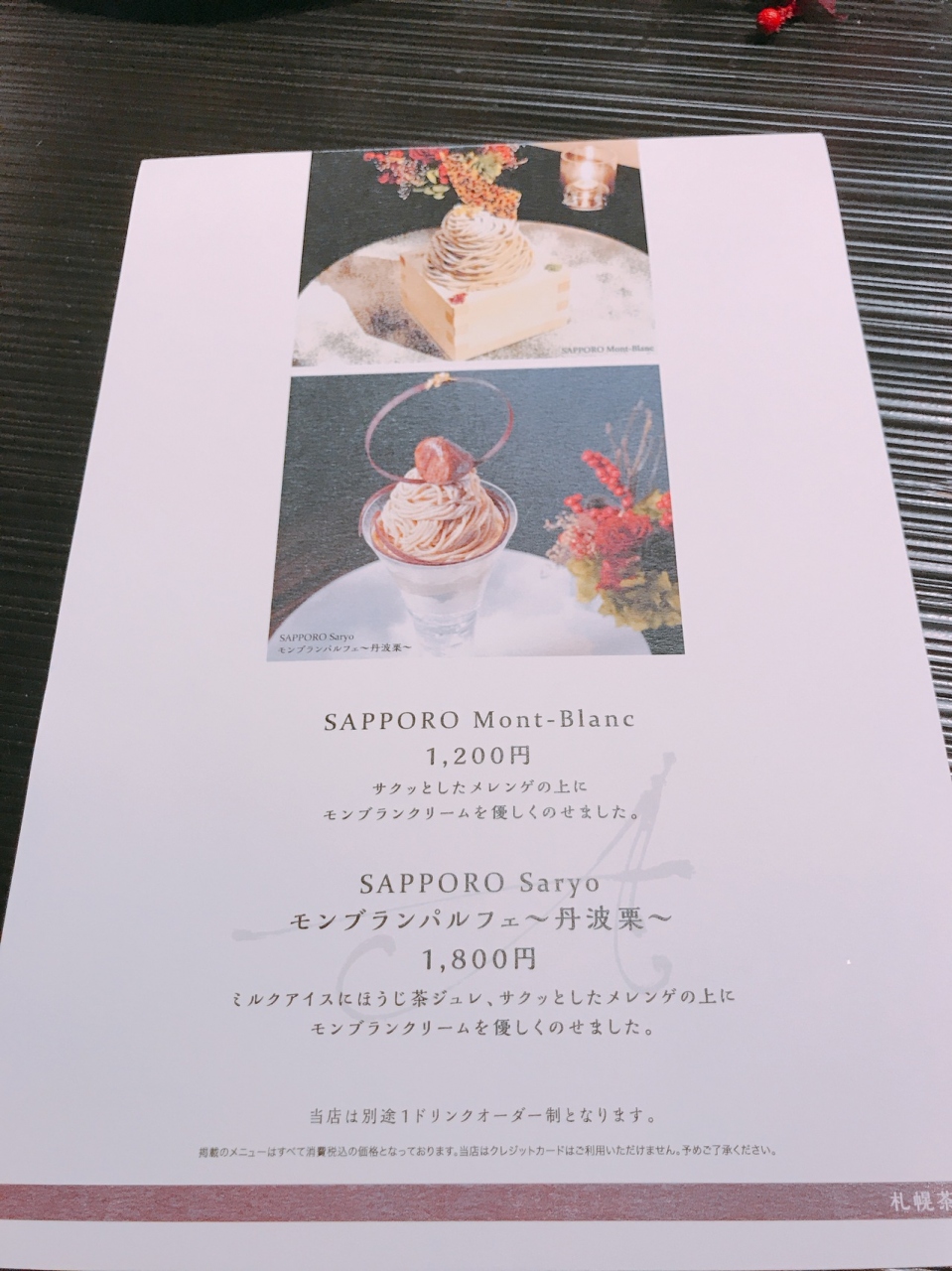 「札幌モンブラン」とモンブランパルフェ~丹波栗~」とほうじ茶と煎茶を注文。