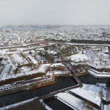 城郭である五稜郭は文字の通り取り囲む堀が五角形になっていることから五稜郭と名付けられている。五角形はきれいにバランスが取れている五角形ですが、平地からだとその形が分かりにくいです。そこですぐ隣に立つ五稜郭タワーから見ると切れにその五角形を見ることができます。タワーの中は歴史資料館ともなっていて幕末の様子がよくわかります。