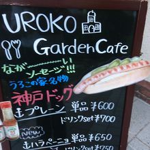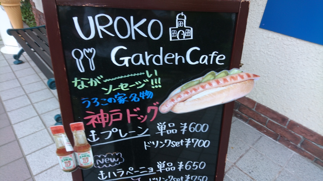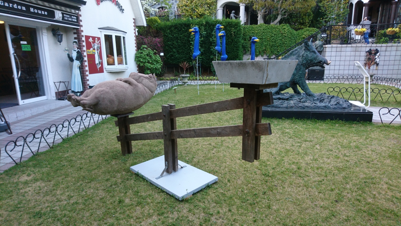 イノシシの像があるうろこの家にあるカフェです。うろこの家は、外国人専用の高級貸家として明治後期に建てられました。今は、国の登録有形文化財や兵庫県住宅百選にも指定されています。そんな建物、イノシシのいる庭を見ながらビールや名物の25センチのロングソーセージが入った神戸ドッグがいただけます。明治の外国人もこうして休日を過ごしなのだなと思いをはせながらいただきました。