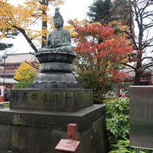 浅草寺の境内、本堂の西側、影向堂の前の参道に聖観音菩薩像が鎮座されております。1720年に多くの人の寄進によって製作された銅製の観音様で、台座には千日供養仏と刻まれています。柔らかに優しい顔をしている観音様で、浅草寺の屋外にある仏像の中では一番良いお顔立ちをしていると思います。