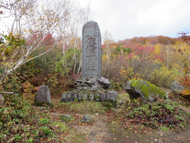 地獄沼のそばの少し高くなったところに大きな石碑がありました。ここに初めて知りましたが、八甲田山界隈の案内人として有名な方だったようです。酸ヶ湯温泉の発展にも貢献した方なのだろうと思いました。紅葉が石碑の周りを彩り美しく見えました。
