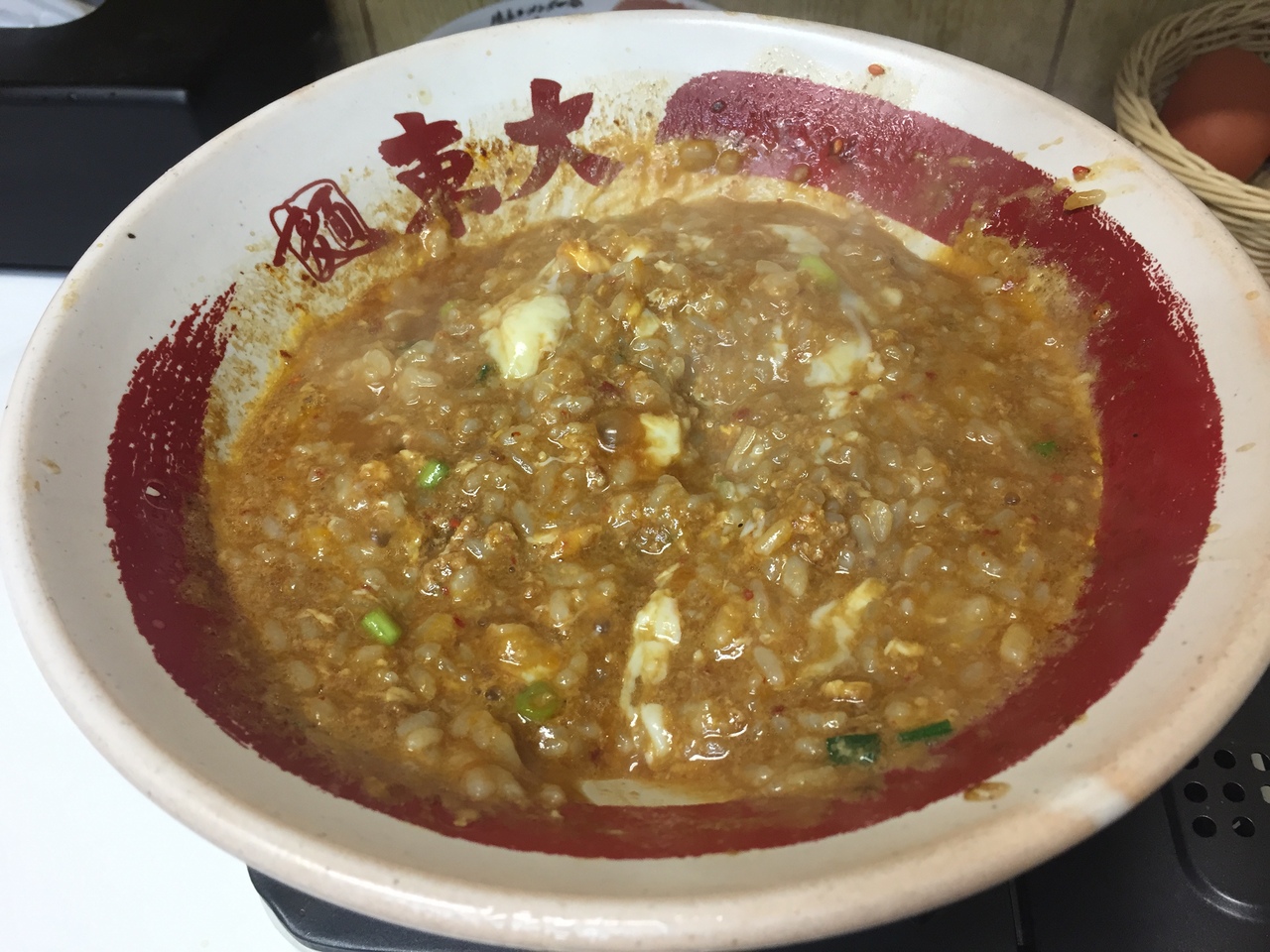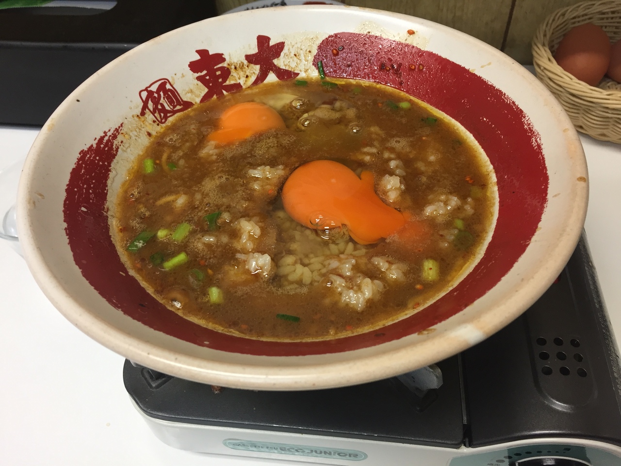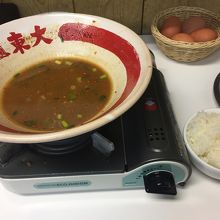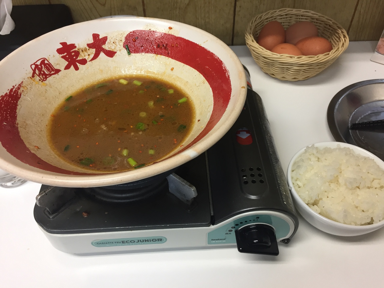 ラーメンの食べ方の概念が覆されるメニューがこちらにありました。まずは普通にラーメンとして食べます。もちろん玉子は何個でも無料!麺を食べ終えたら、店員さんが小さなコンロと小ご飯を持ってきます。そして、ラーメンの器ごとコンロに!!グツグツなったらご飯を入れて煮込み、玉子を落として雑炊に。これが美味しい!!癖になりそうです。