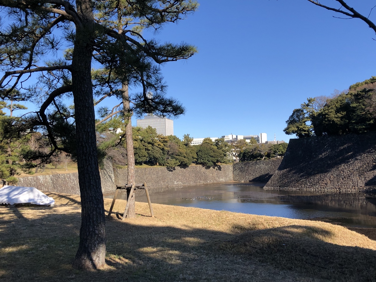 西桔梗門跡と北桔梗門の間にある濠なので、皇居東御苑からも見ることが出来ます。江戸城の城壁と遠くに見えるビルのコントラストが美しく感じる濠です。