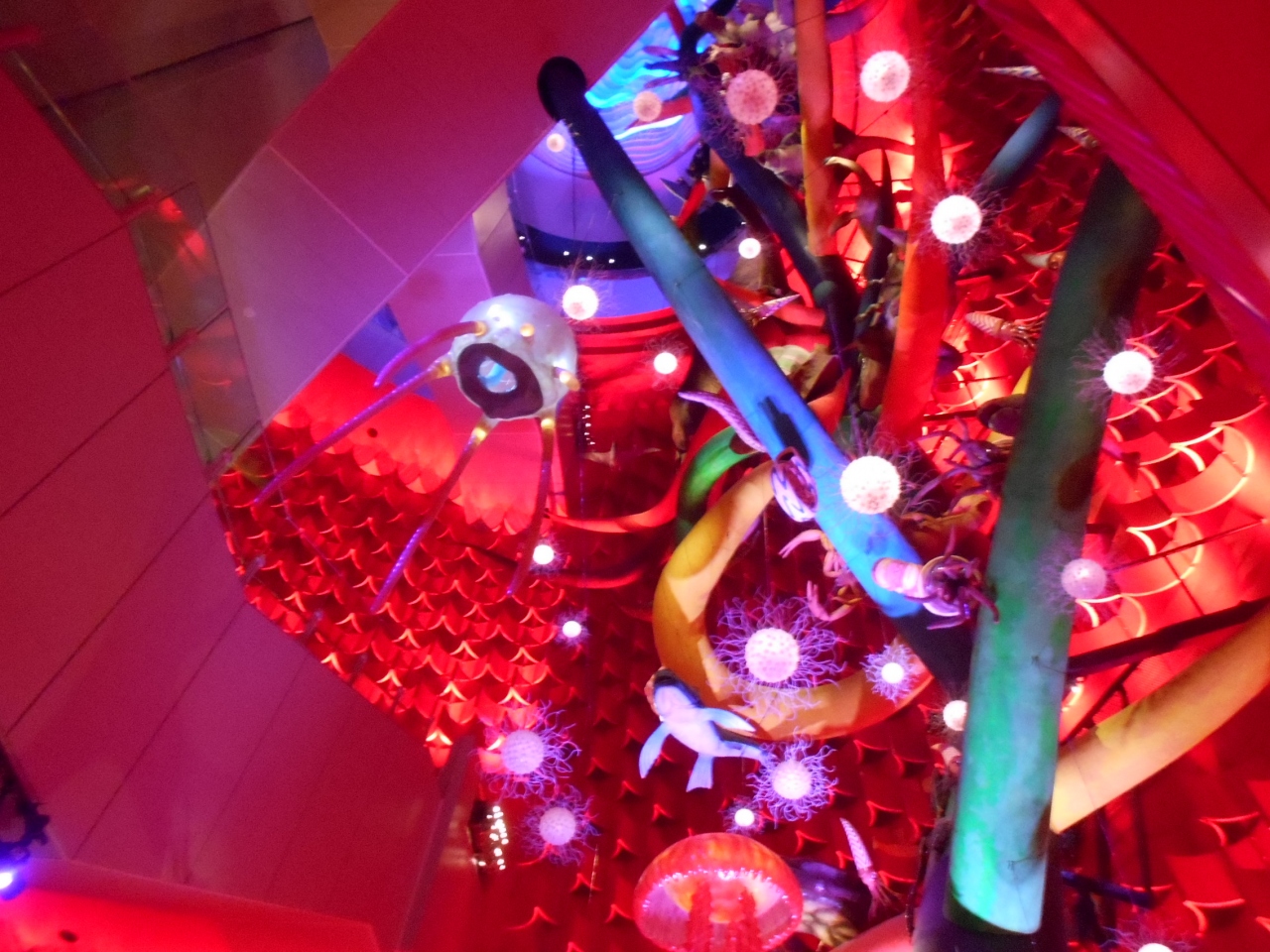 殆どの部分はリニューアルで色も塗り直され、赤を基調とする彩は、音楽とともに照明の変化で浮かび上がり、躍動する。正に生命を感じるツリー状のオブジェだ。