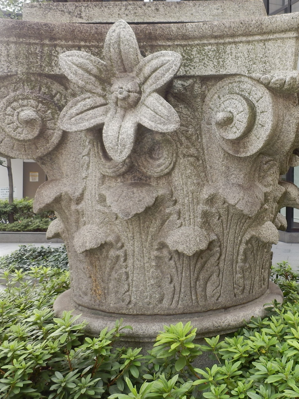 戦前に建てられた銀行は威厳を示す為か玄関の門柱は巨大な石造りの銀行を多く見かけたが建て替え時は変哲もない機能本位のビルに代わったのでこのような柱頭を乗せたビルは皆無となった、この三菱銀行は最小限門の梁を支える頭部分を残していた、石に丁寧な装飾が彫り刻まれており当時の銀行としての格式を表現していたのだろう