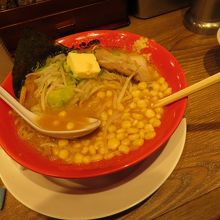 コーンたっぷりの熱々麺、味噌味なので体が温まります。
