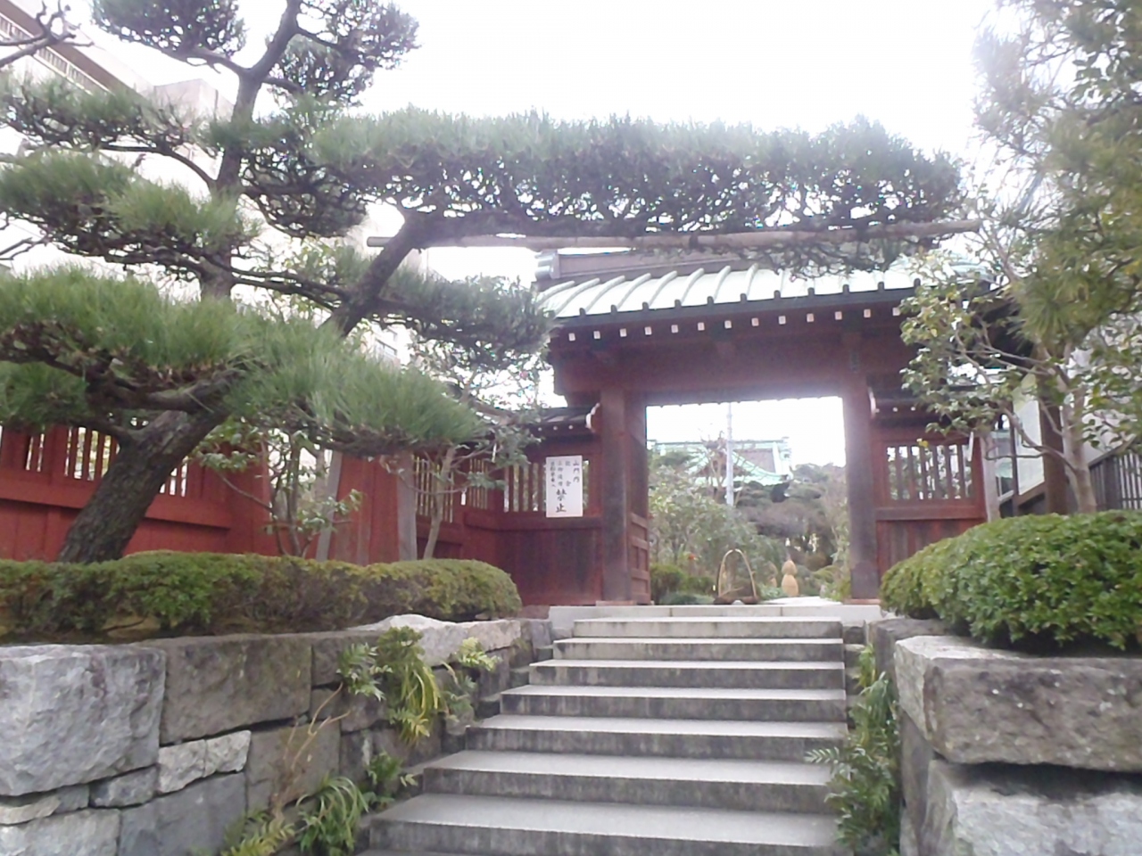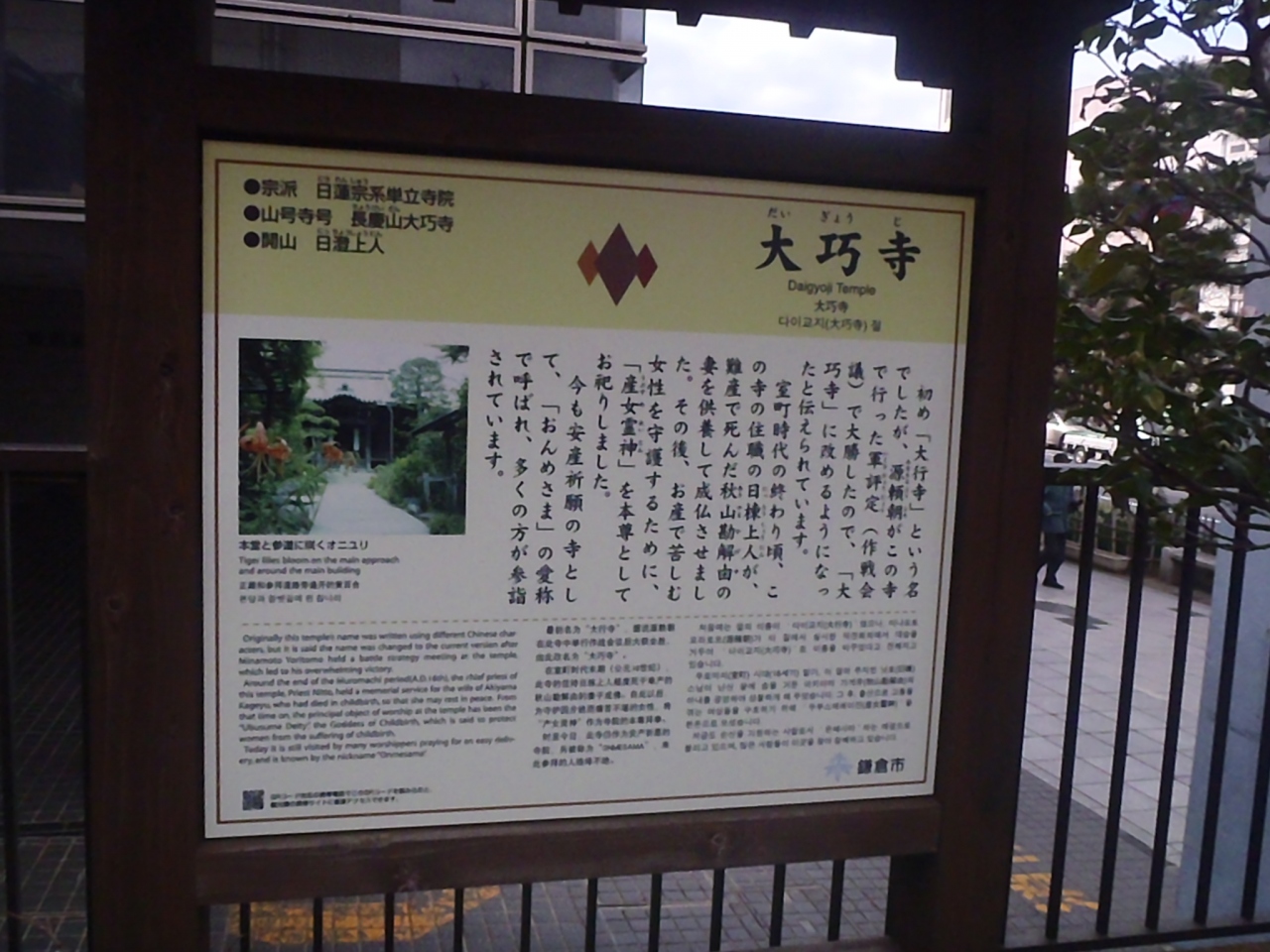 JR鎌倉駅東口から東へ真っすぐ若宮大路を渡って徒歩5分弱、朱色の壁に囲まれている日蓮宗長慶山正覚院大巧寺があります。