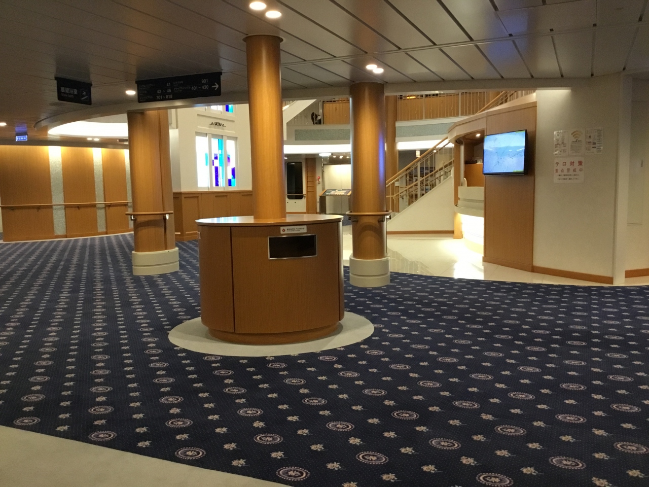 新しくて清潔な船。テーマソングがうるさくかかることもなく、小さなオルゴール音楽がかかっていて上品な雰囲気でした。売店がないので洗練された感じです。お風呂も広くて快適でした。