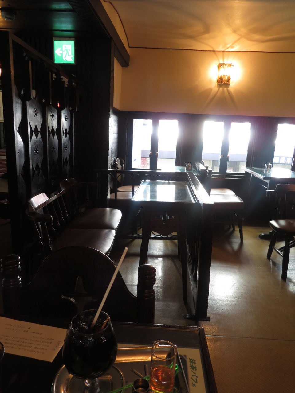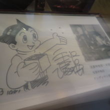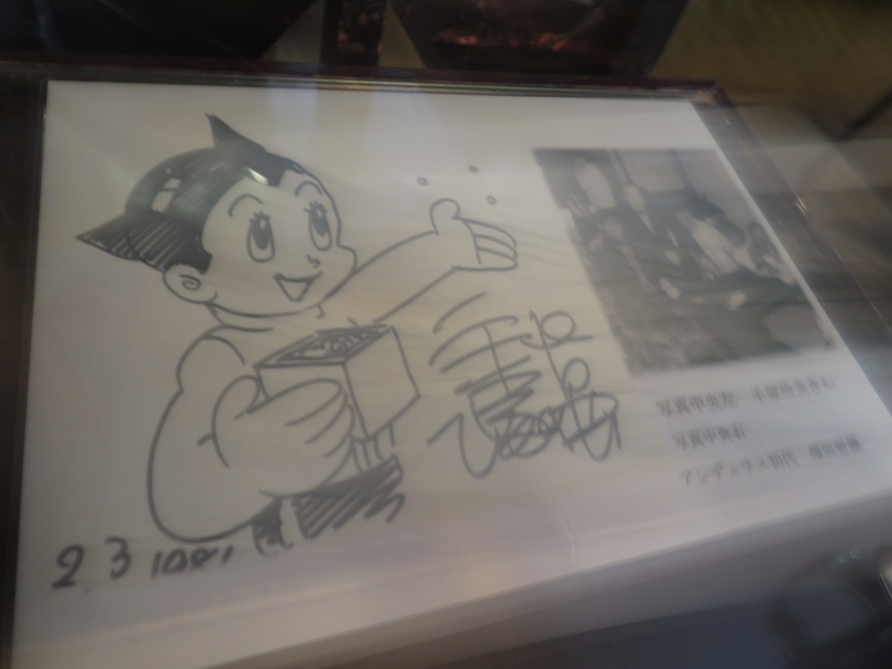 案内された席は2階席、狭い階段を上がりましたが、なんと手塚治虫さんが来店したときにかいたかわいらしいアトムが豆まきをしてる色紙が飾られたテーブルに座れました。
