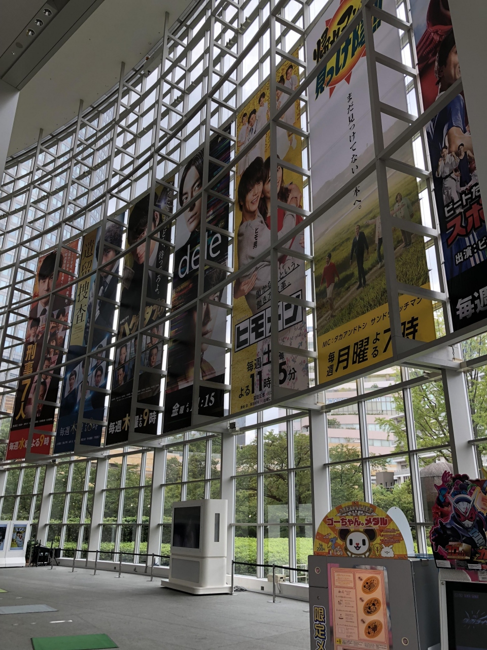 六本木ヒルズの隣にテレビ朝日の本社があります。ガラス張りの外観でかっこいい建物でした。外からよく見えるように、内側に大きなポスターがいくつか貼ってありました。1階には誰でも入ることができ、ドラえもんやテレ朝のキャラクターなどがいました。
