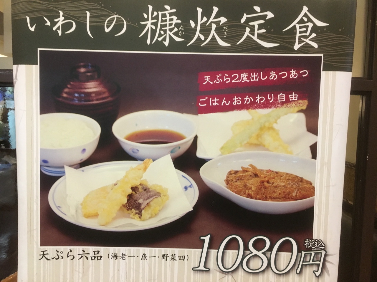 天ぷら6品にいわしの糠炊きが付く定食にした。