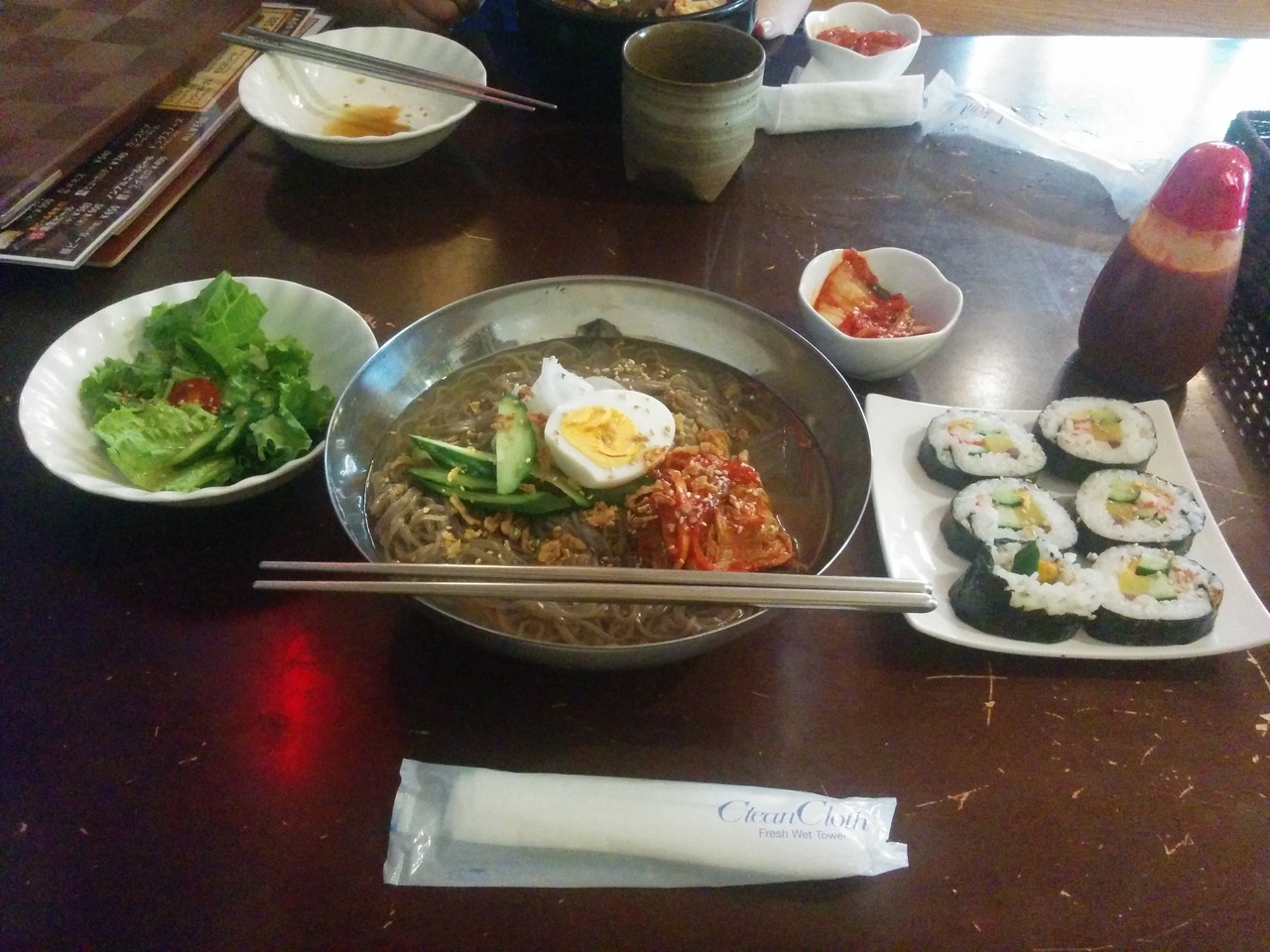 こちらのお店は、日曜日でもランチを行っておりました。キンパ&冷麺セット1050円を食べてみました。サラダ、キムチ、ドリンクもついてました。
