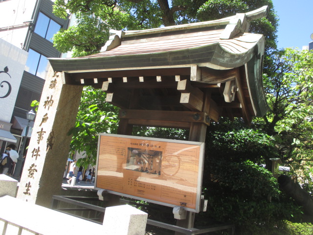 慶応4年に肥前藩の隊列が行進中、三宮神社前で、その隊列を横切った外国人の水平数人が隊列を横切って切り付けられた。後に、砲兵隊長が切腹させられたという事件です。命の尊さを全く分からなかった武士の悲しい事件ですね。現代では考えられないことです。