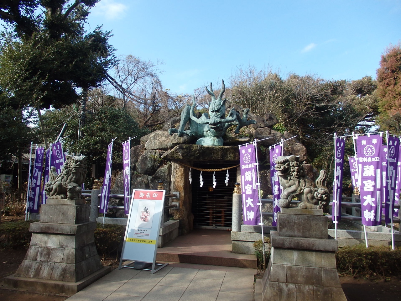わだつのみやと読みます。奥津宮の隣にあります。御祭神は龍神です。ここ江ノ島には龍の住むところと言われ、龍に纏わる伝記が多く残されている関係で、平成6年、岩屋洞窟の真上に宮を建立する。岩を積み上げた岩屋に睨みつけるような眼をした恐ろしい顔を持ち、龍珠を咥えた青銅製の龍が鎮座しています。祠の中は薄暗くて良く見えませんでした。ここもパワースポットとして人気があるようです