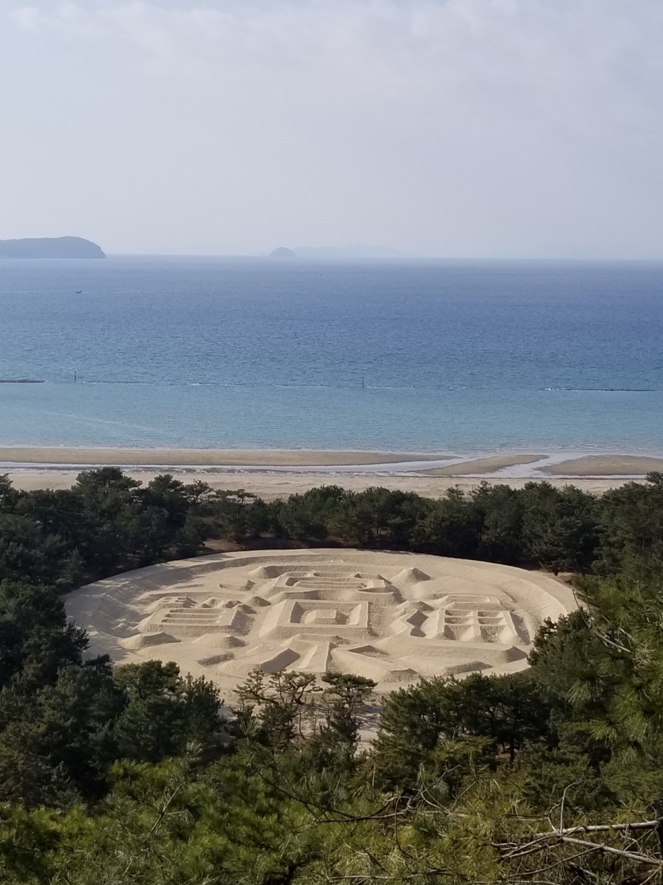 展望台からは砂絵と海が望め、この砂絵を見た人は健康に長生きでき、お金にも不自由しないと言われているそうです。