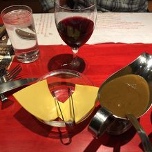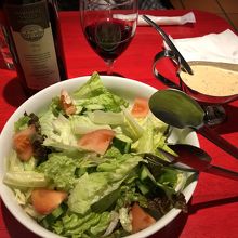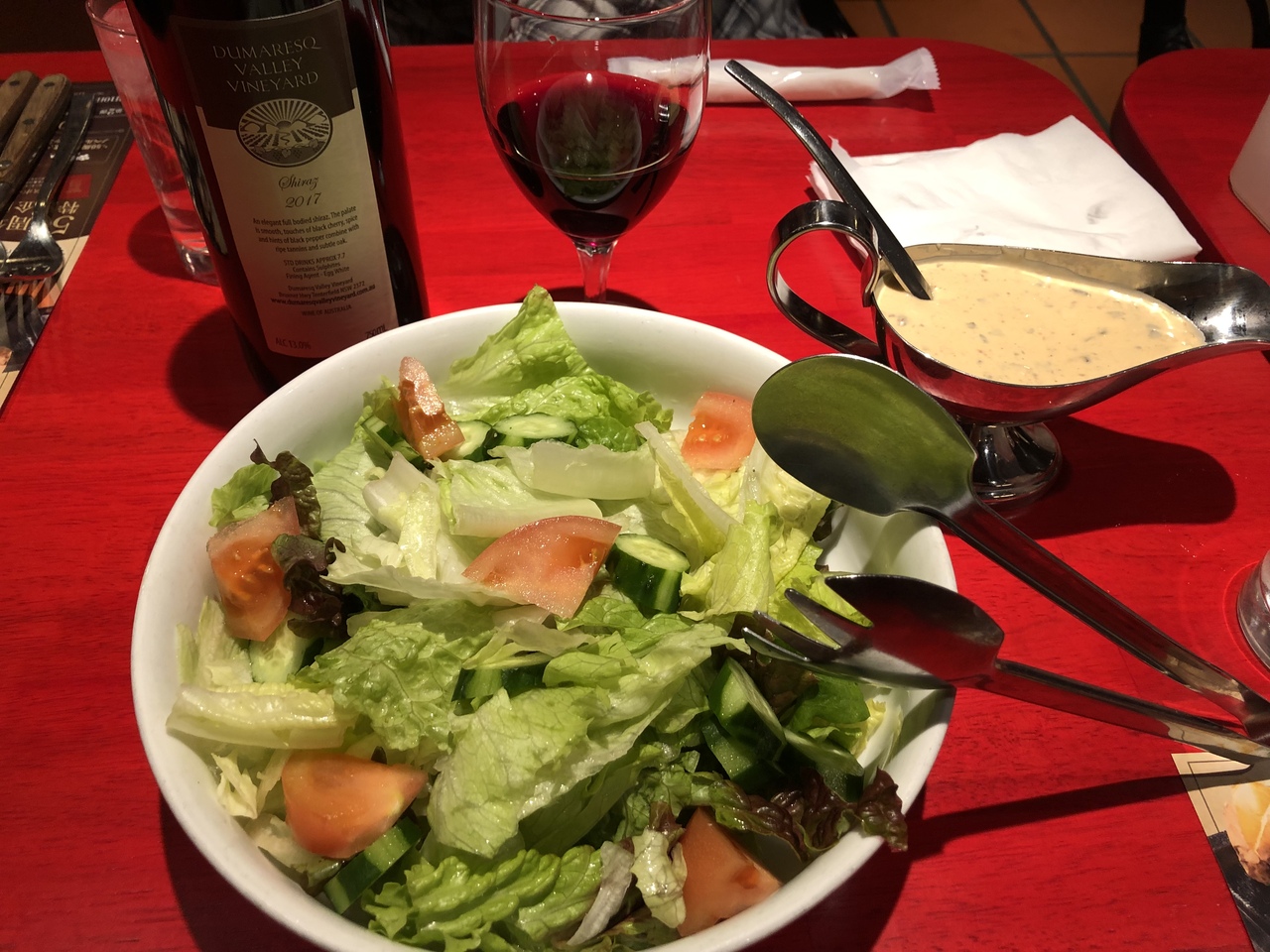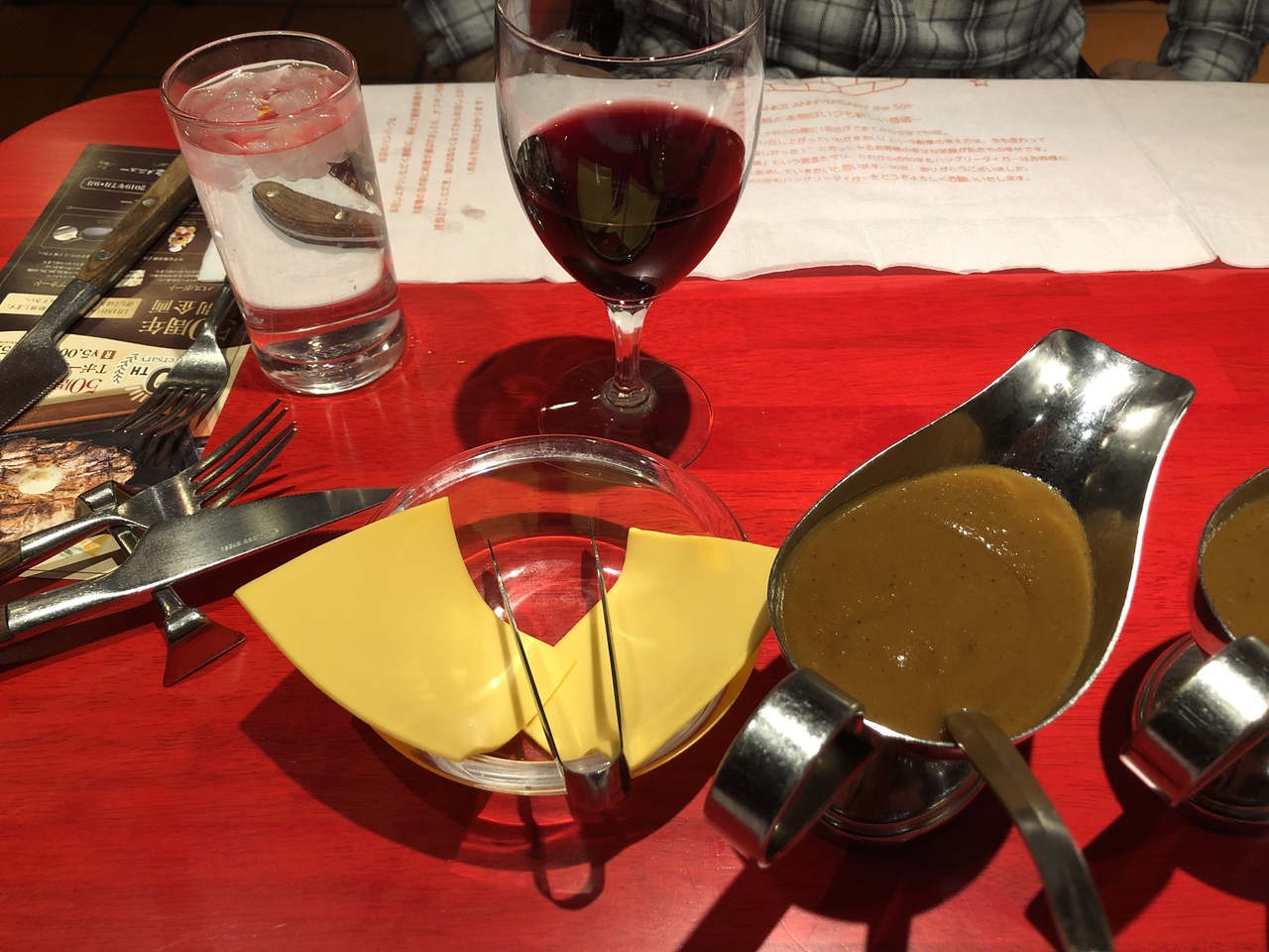 ダブルハンバーグステーキ単品(220g×2個)2,130円、トッピングチーズ(スライスチーズ2枚を相方とシェア)170円、パン 220円を注文。サラダはグリーンサラダにしました。あと赤ワインボトルも忘れずに注文。