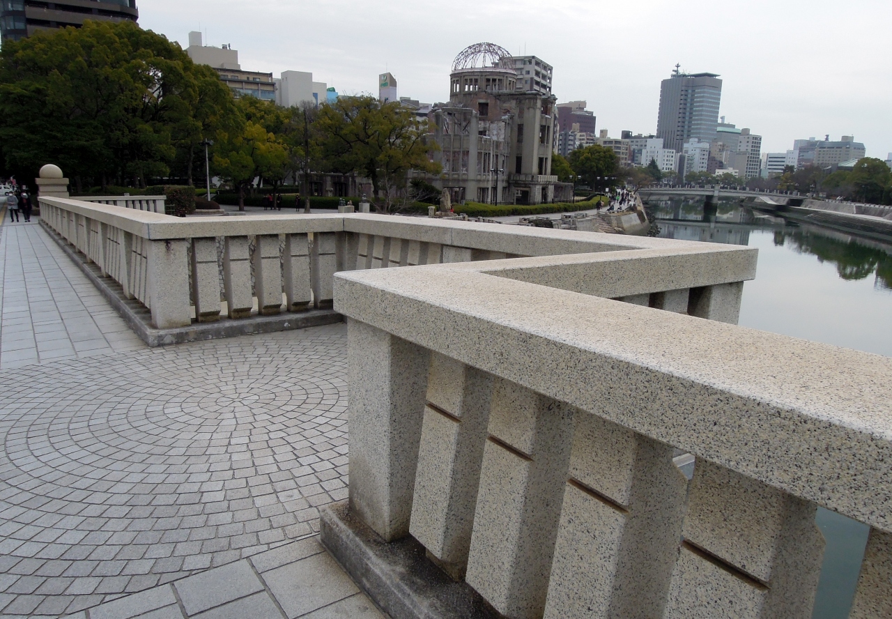 平和記念公園の北側を走る国道183号に架かる道路と電車の両用の橋だ。太田川と元安川がわかれる地点に架かっており、全国的に見ても珍しい「T字」をしている。上空からもよく目立つ形だったため、原爆投下の目印になったという。橋を照準器にしたのかと思うとやり切れない。