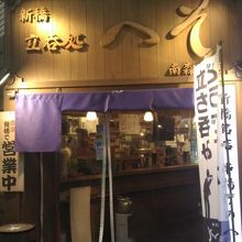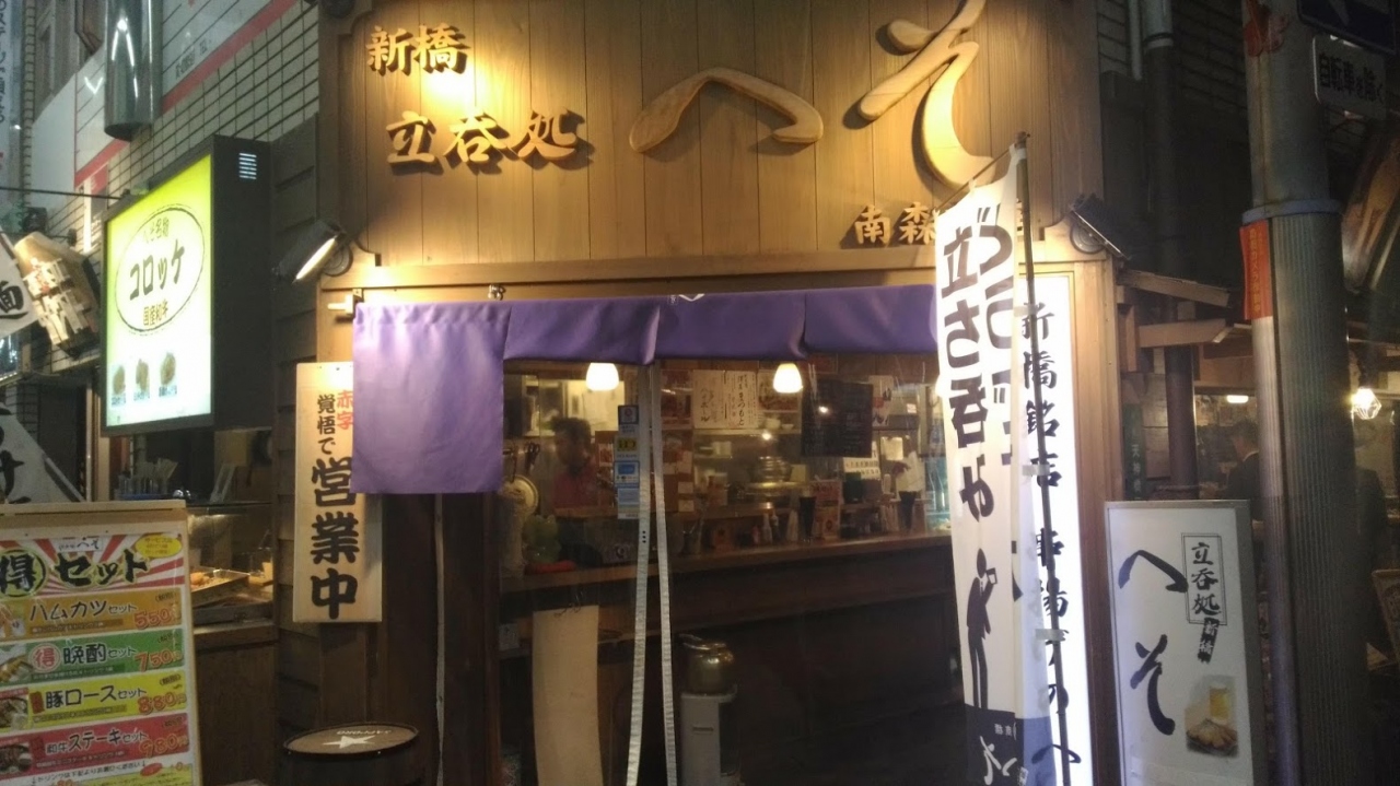 天神橋筋商店街3丁目にある立ち飲み屋です。このあたり立ち飲み屋は多いですが、比較的広い店で、カウンターとテーブル席あります。看板見ると新橋で人気の店、新橋は東京の新橋で、このあたりでは珍しい東京のチェーン店です。