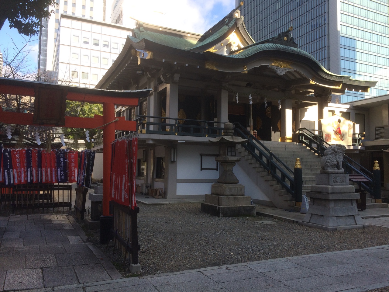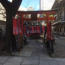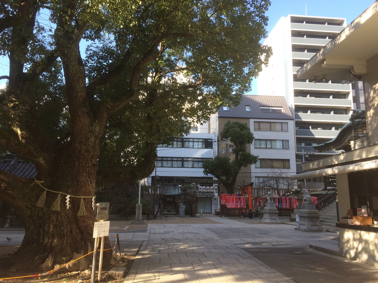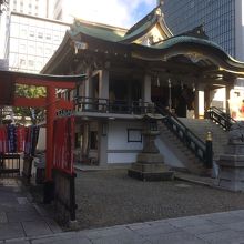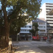 塀に囲まれていて中に入ると大きな木があり目を引きました。社殿は2階建てで階段を上がりお参りすることとなります。社殿の前にある左右の獅子の像が威厳がありました。境内のが中にも赤い鳥居があり朱色のが眩しい色でした。綺麗な境内で参拝しやすい神社でした。