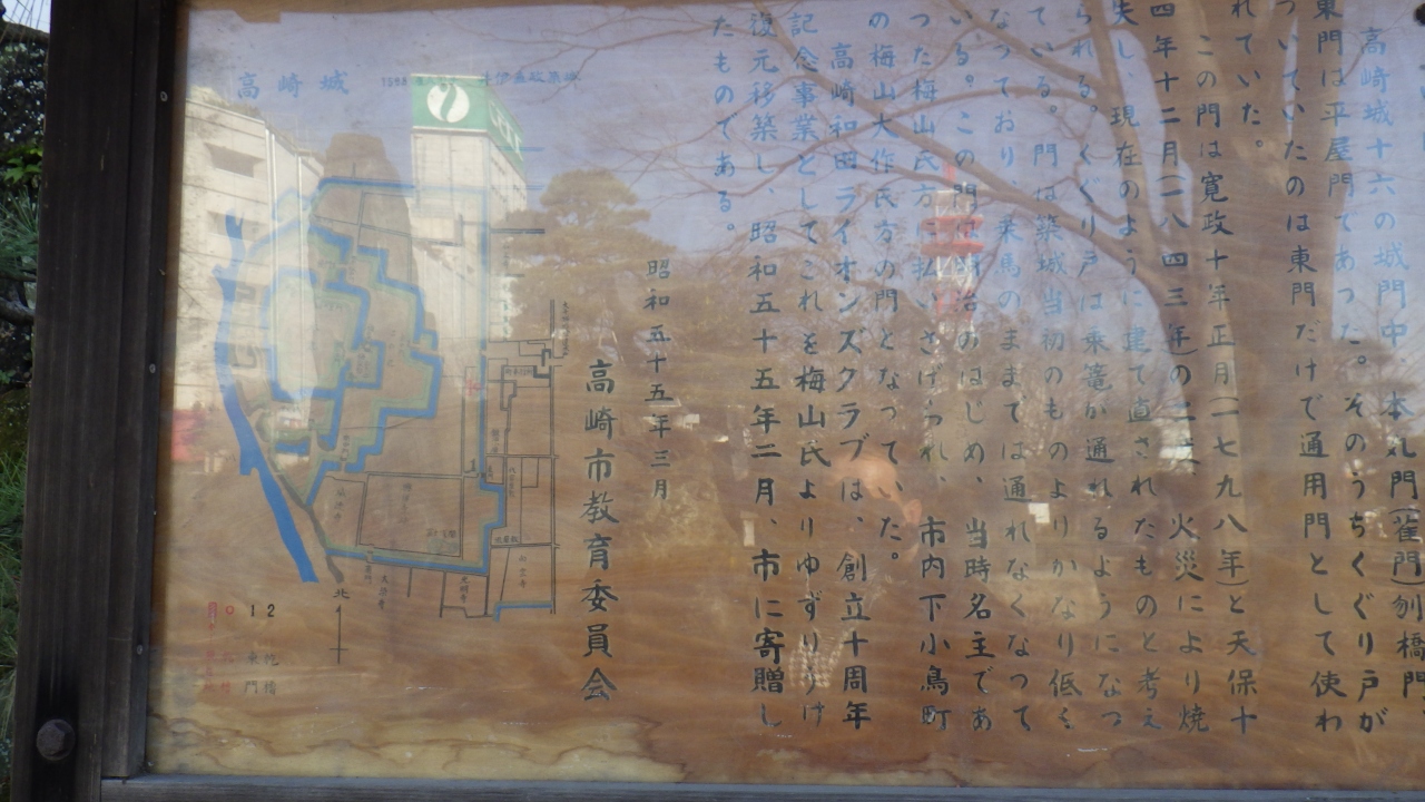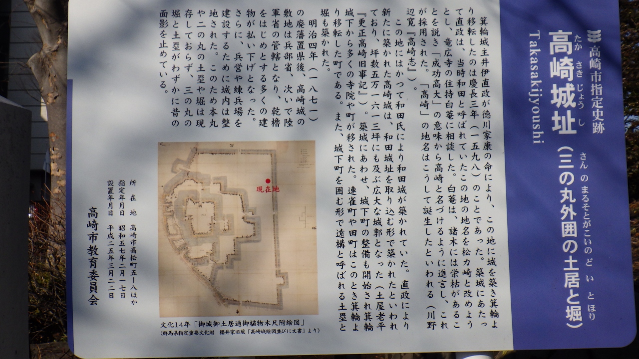 JR高崎駅から西へ徒歩20分ほど、徳川四天王のひとり井伊直政の居城として有名ですが、現在は本丸はなく石垣と濠、移設復元された乾櫓と東門があり城址公園として整備されています。周辺には音楽センターやシティーギャラリーなどがあり高崎市の文教地区中心地にあり市民の憩いの場として使われています。
