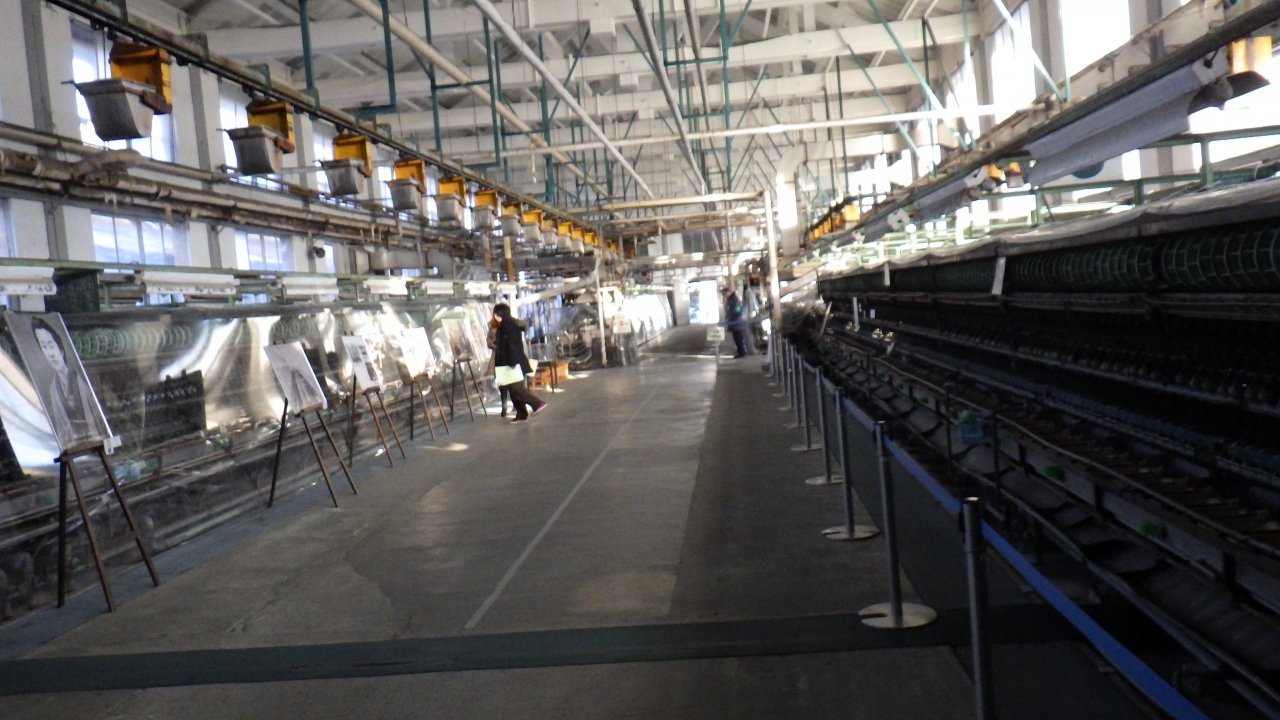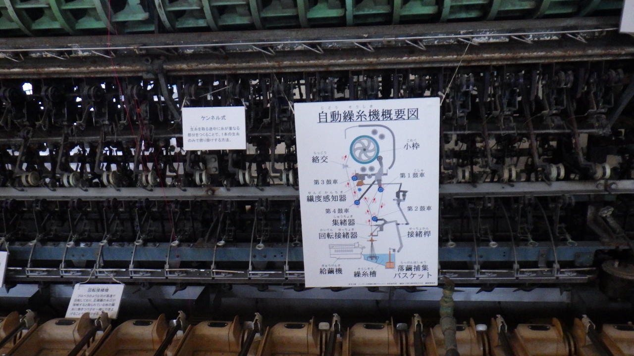 繰糸場は繭から生糸をとる作業が行われた場所で、フランス式繰糸器300釜が設置された世界最大の工場で、室内には昭和40年以降に設置された自動繰糸機とトラス構造小屋組みを見ることが出来ます。