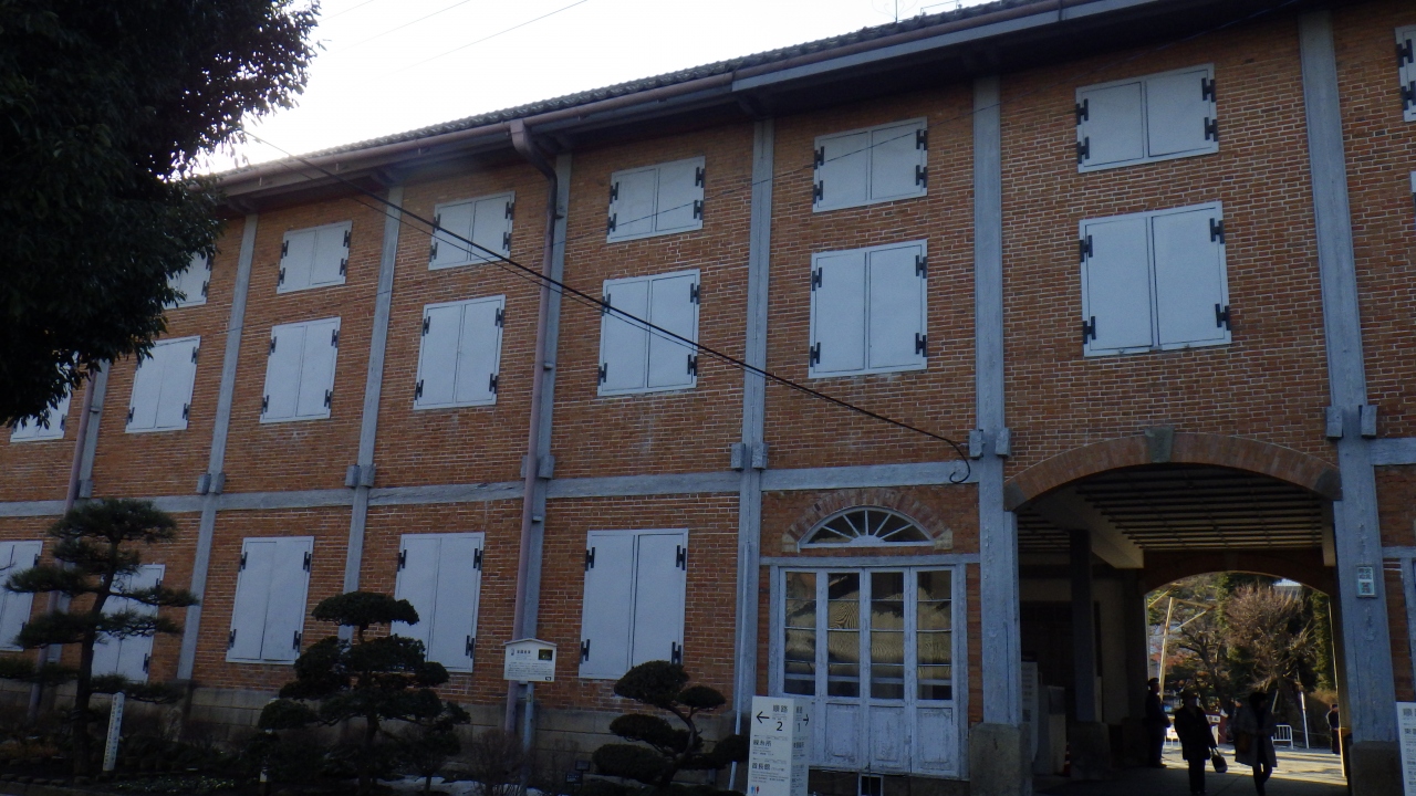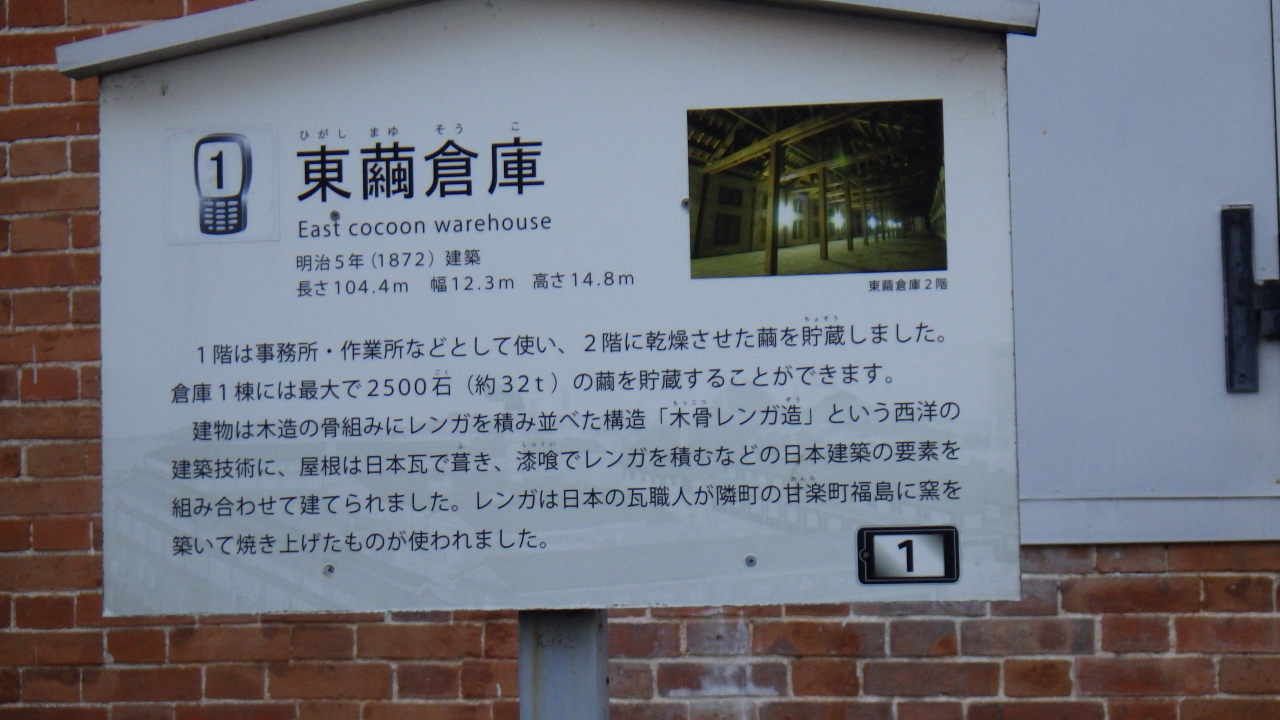 入口を入ってすぐ正面にある木造骨組みレンガ造り西洋建築技術で建てられた長さ104.4mの国宝に指定された施設で2階貯蔵庫には乾燥した繭を最大2500石約32t貯蔵できたそうです。