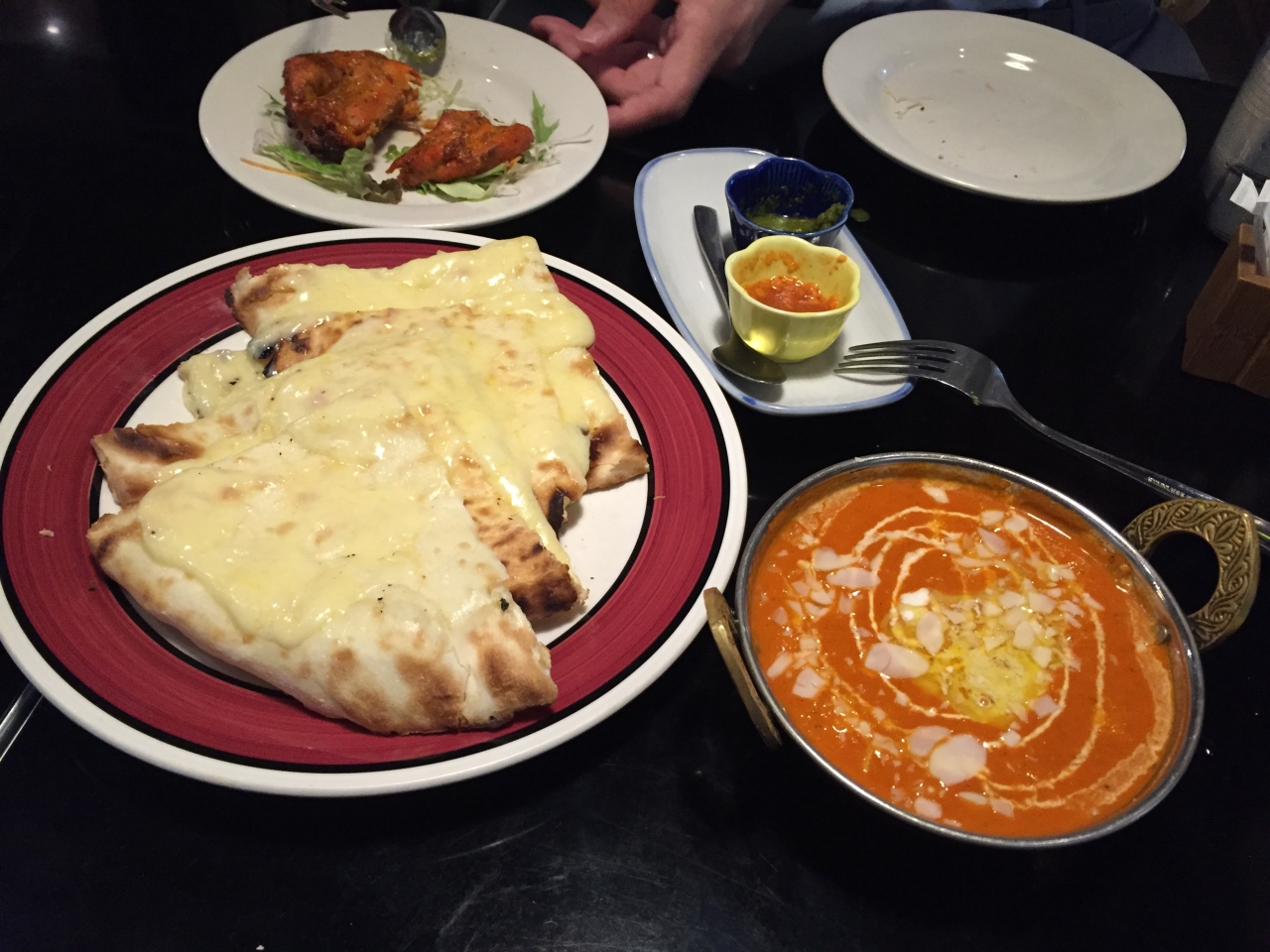 平日の夜に訪問。お店はガラガラでした。チーズナンとバターチキンを注文。バターチキンは良くある感じのでしたが、チーズナンの方は、分厚いナンの上にどっぷりとかけられたとろけたチーズが胸焼けしそうです。味は美味しいけど、バターチキンに、チーズナンはおもかった。