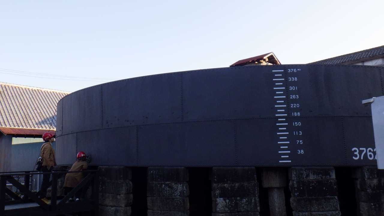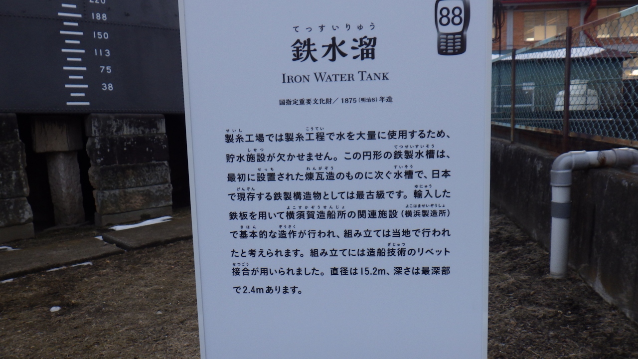 製糸工場では大量に水を使用するため直径15.2m深さ2.4m現存する鉄製構造物日本最古級の鉄製水槽で保存修理工事が行われまじかに見学できるようになった施設です。