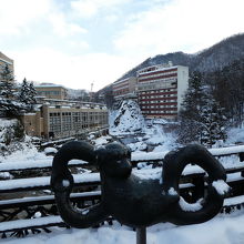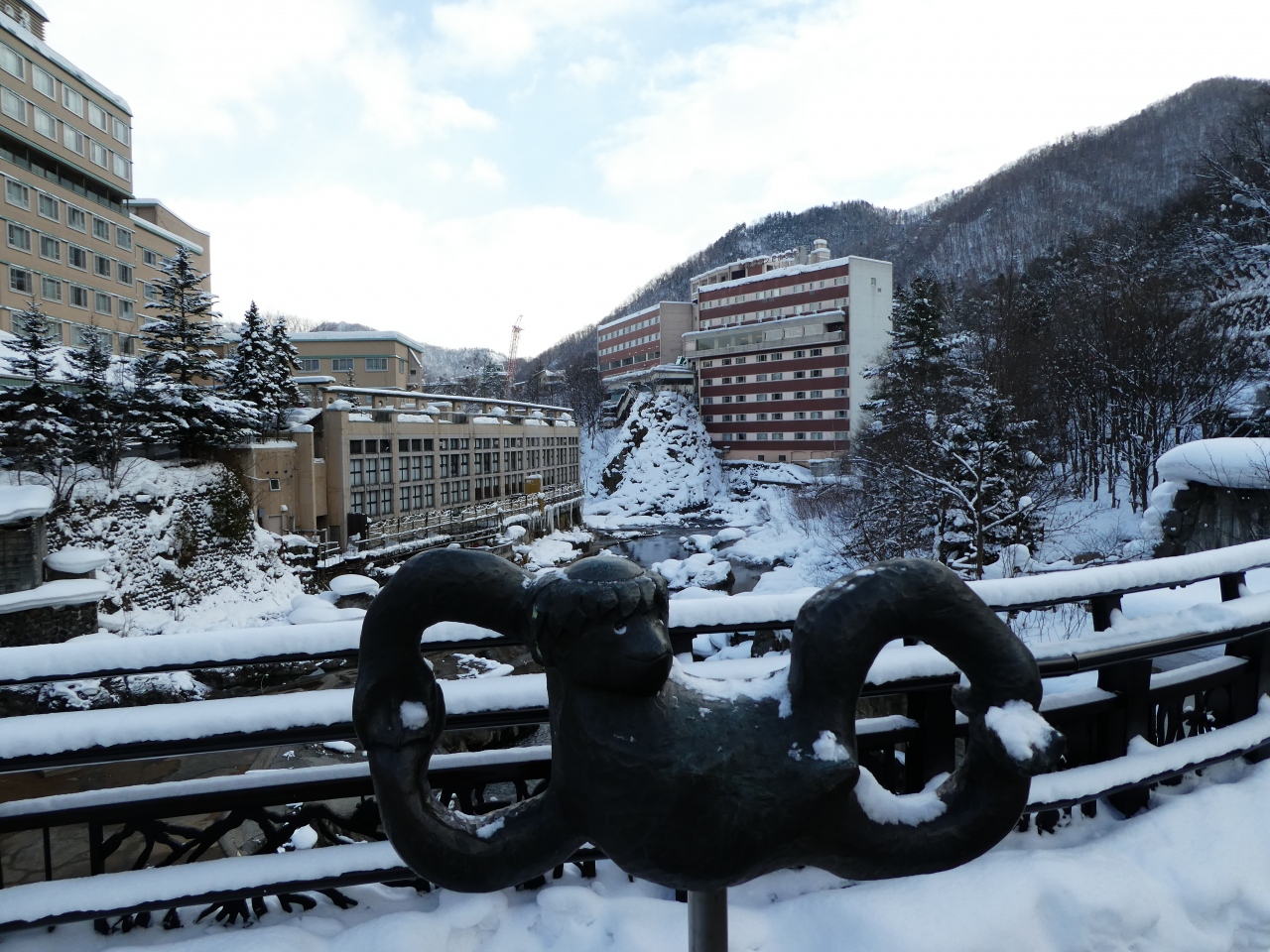 定山渓温泉には、かっぱ伝説があり かっぱは定山渓のマスコットとなっていますが、この橋の欄干にはいくつかのユニークなかっぱの銅像があり、とても面白かったです。遠くには紅葉の時期に人気の二見吊橋もみることができます。
