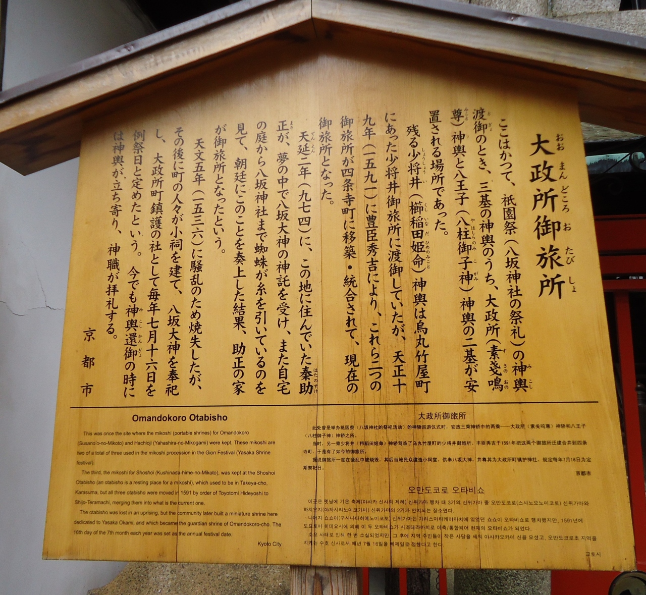 円融天皇の時代に秦助正という人が夢の中で八坂大神の神託を受け、また自宅の庭から八坂神社まで蜘蛛が糸を引いているのを見て朝廷に奏上した結果、助正の家が御旅所となり、その後大政所といわれるようになったという逸話が興味深くて面白いですね。