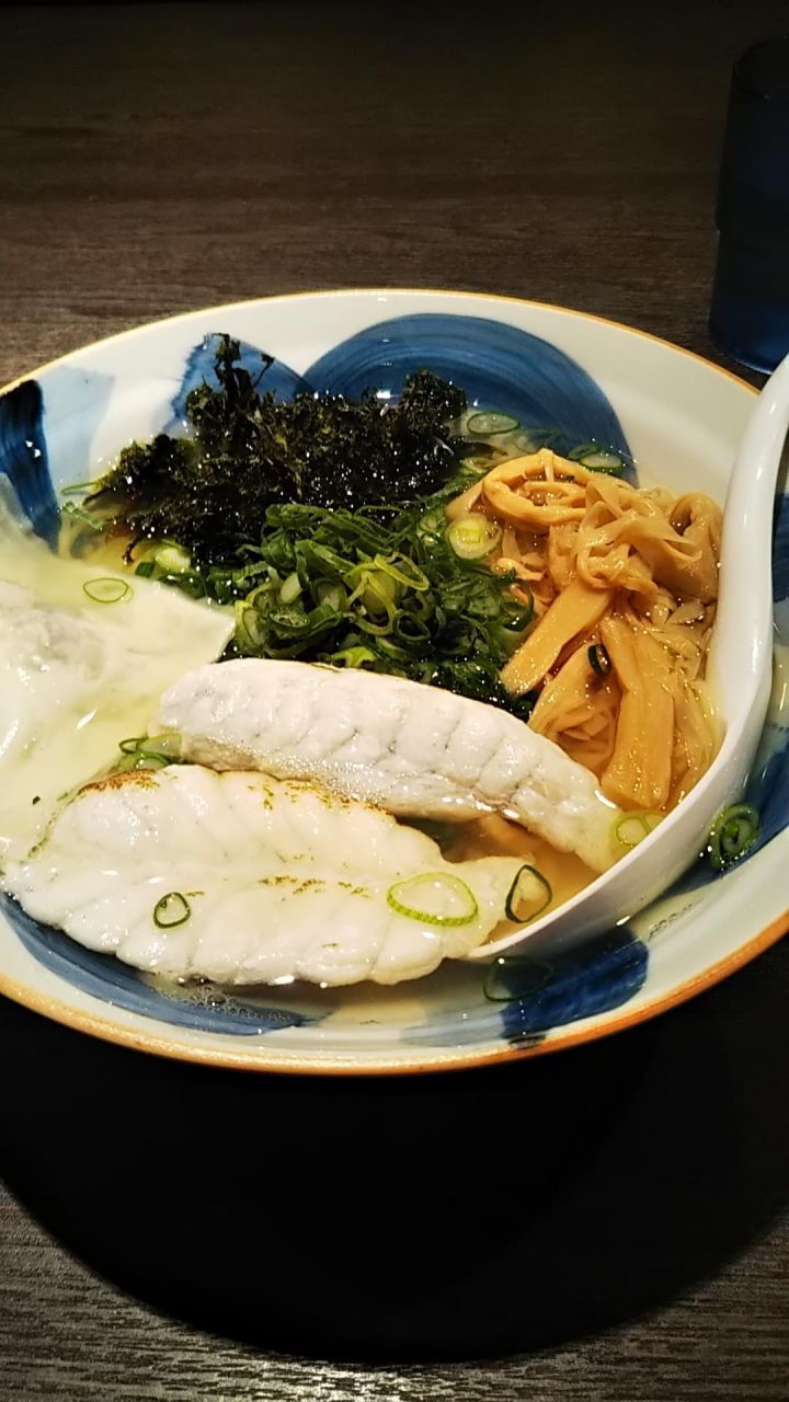 六本木交差点から少し歩いた路地のところにあるラーメン屋さんです。同じビルに同じ店名のフグ料理屋さんがあるので系列店でしょうか。注文したのはふぐラーメン。あっさりとしたスープで、焼いた魚がのっておりました。麺も細めでするするいただけましたが、もう少しパンチが欲しいですかね。