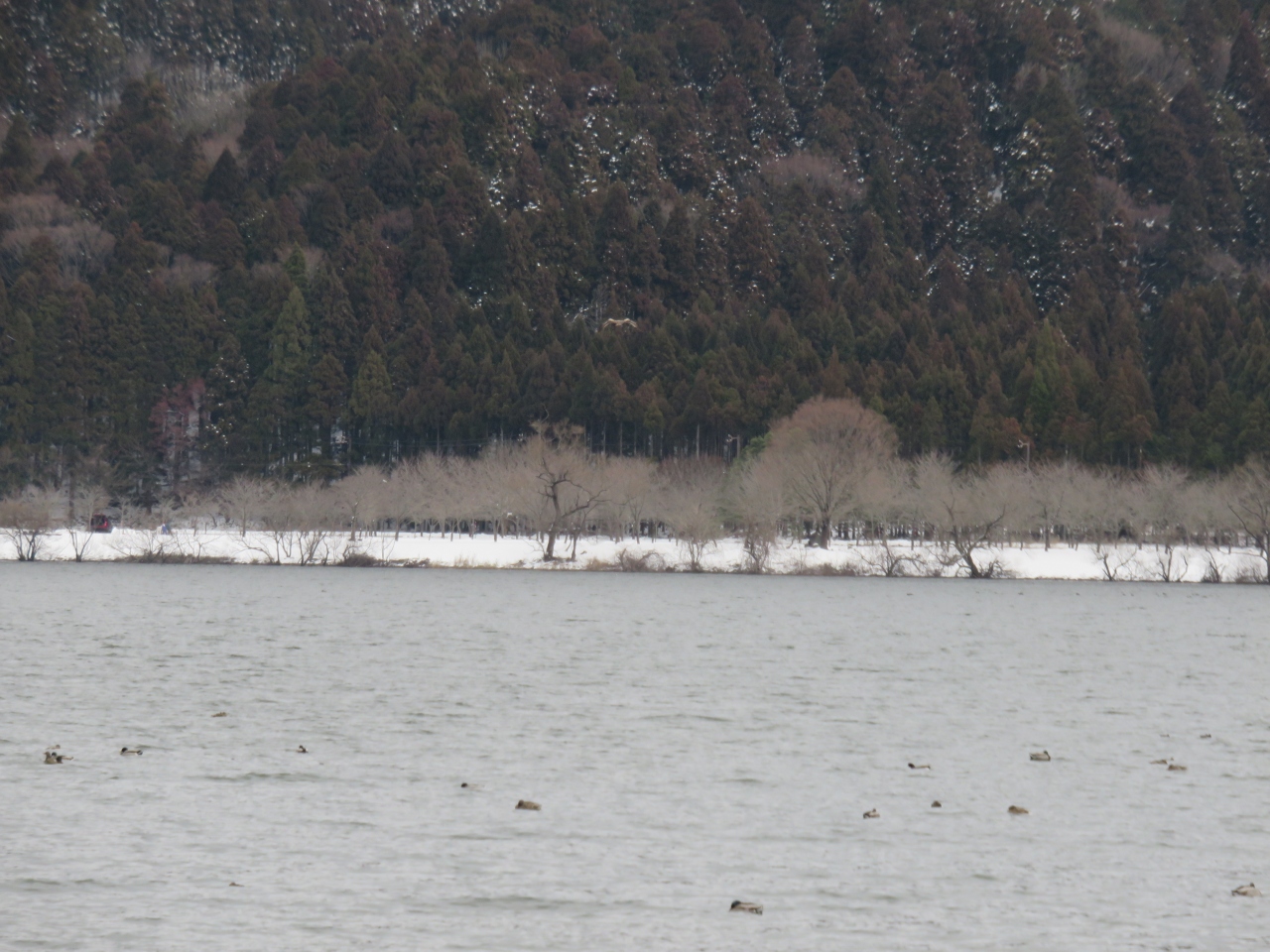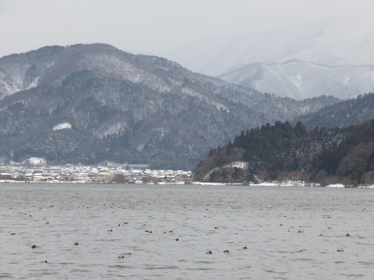 渡り鳥が湖面の上にぷかぷか泳ぎ、遠方には冬山