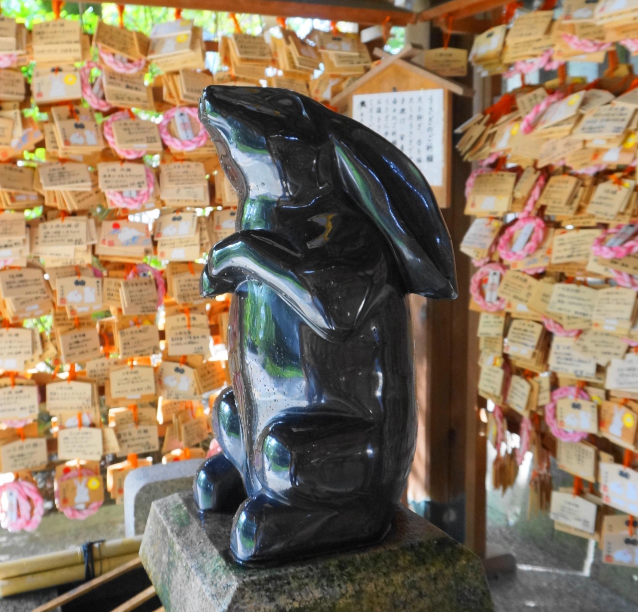 手水舎には黒御影石でできた子授けうさぎ像があります、水を掛けてお腹を擦り祈願すると、子宝に恵まれ安産になるとの信仰 。