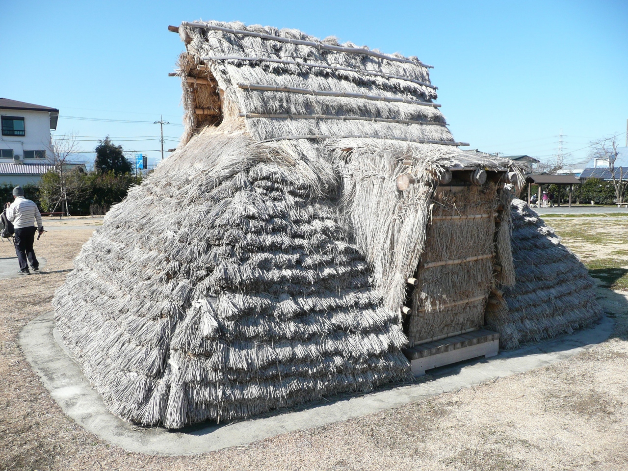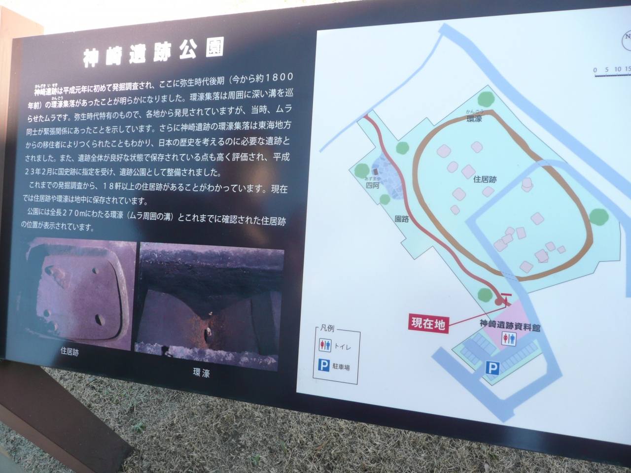 神崎遺跡は公園となっており、園内の案合板によると、今から約1800年前の弥生時代後期の環濠集落とのことでした。広い園内の中央部には、復元した竪穴式住居が2棟建っていました。