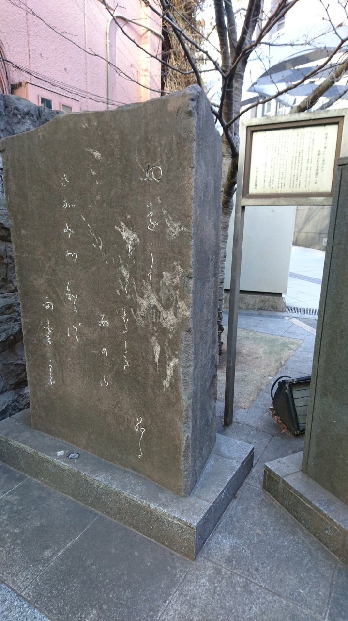 道玄坂の坂上の交差点の一角に与謝野晶子の歌碑がありました。与謝野晶子は1901年に郷里の大阪から上京し、道玄坂の近くに住んでいたそうです。歌碑に彫られている筆跡は本人の書簡による集字ということで、与謝野晶子本人に会えたような気がしました。