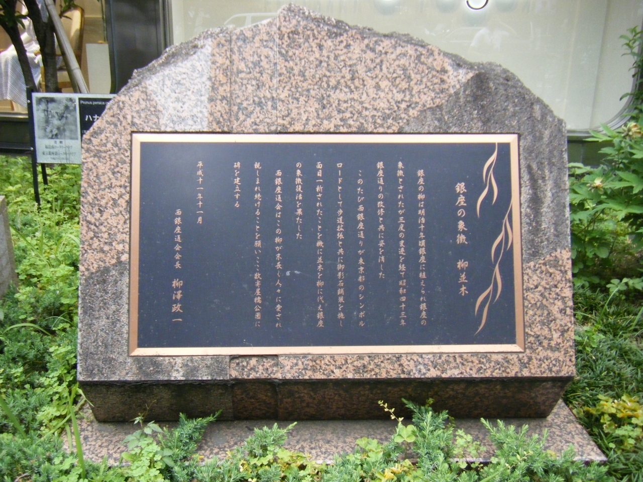 銀座の象徴 柳並木の碑は数寄屋橋交差点のすぐそば、案内板がたくさん並んでいる一角に置かれています。銀座の柳は明治時代に植えられましたが、除去されたり、再興されたりを繰り返しながら現在に至っているそうです。銀座一丁目交差点そばにも同じような史跡があるのですが、別々に作る必要があるのでしょうか。