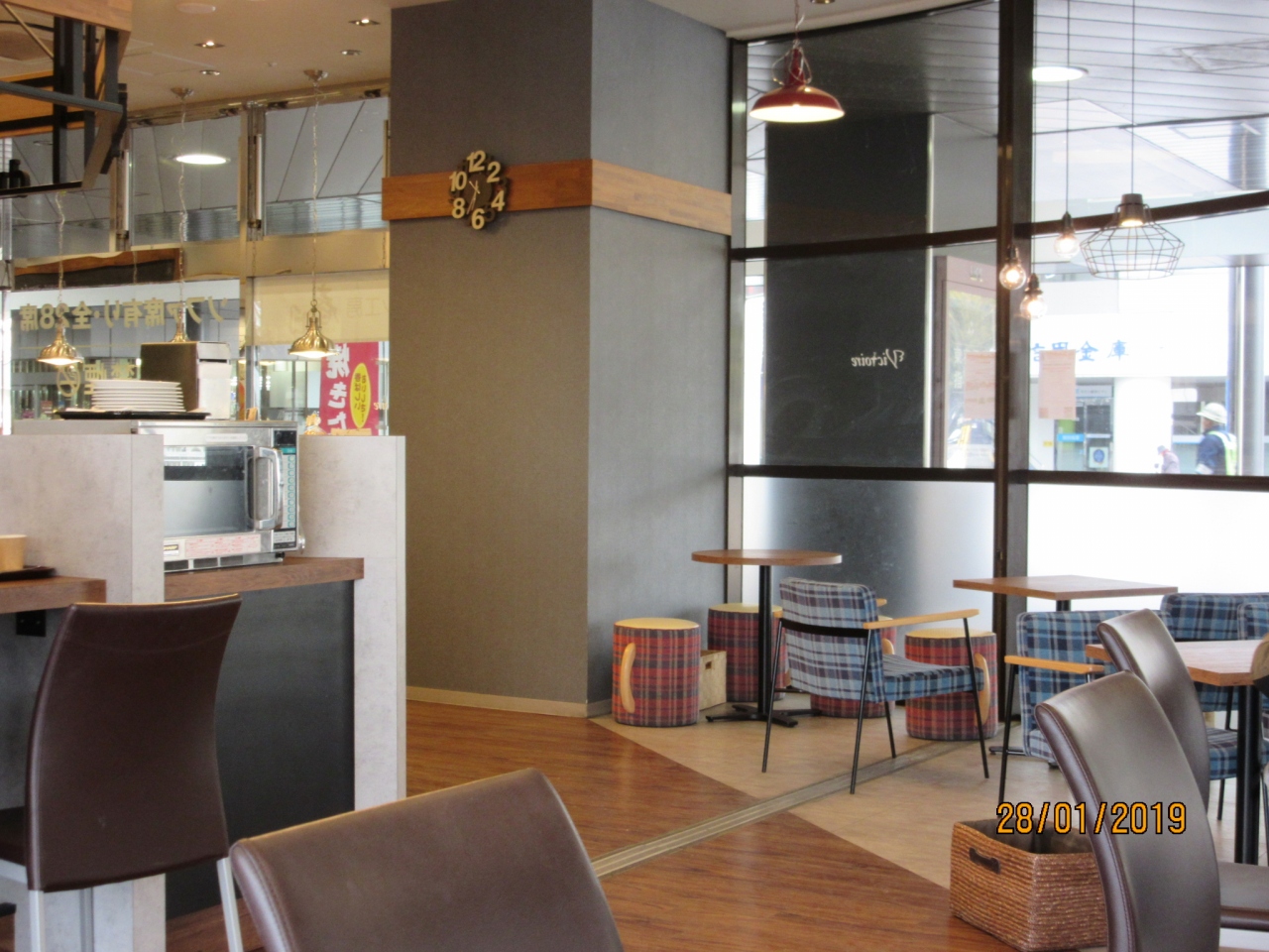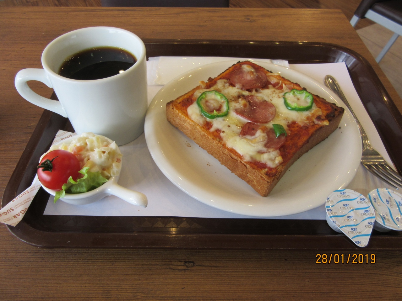 やむなく駅構内を探すとこの店を発見。ベーカリーと喫茶店併設。モーニングセットは3種類でピザセット450円を注文。11時までがモーニングタイム。全席禁煙。