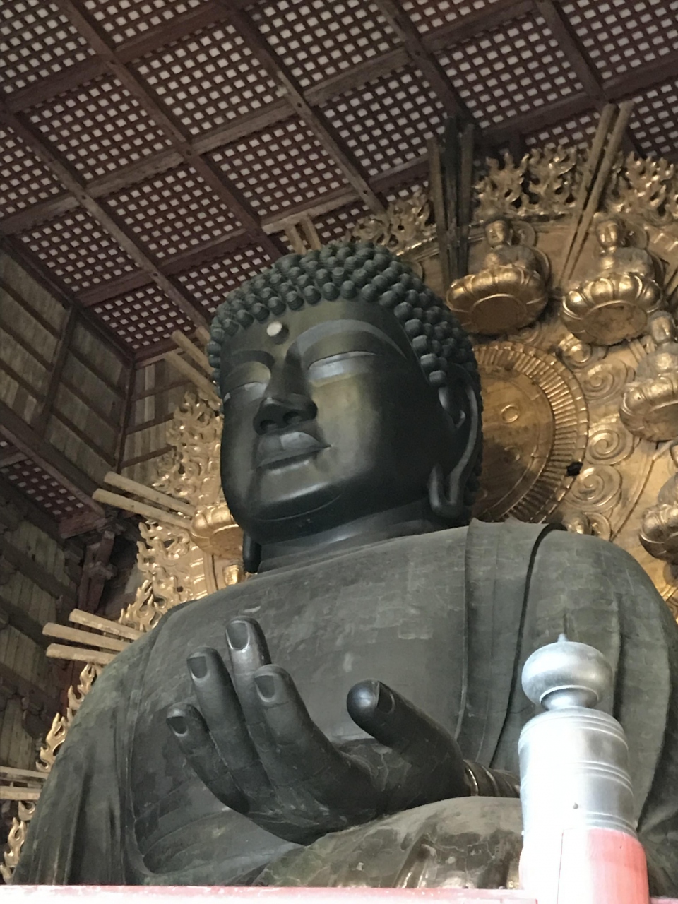 奈良といえば、東大寺の大仏さま。ここが一番観光客が多かったです。近鉄奈良駅から歩いて行ける距離にあります。拝観料は一人600円。ミュージアムとのセットもありました。海外の方も多くなってて、自国の方法で線香を持ってお参りされている光景をたくさん見ました。大きいと感じても、なんだか分かりにくいのですが、鼻の穴と同じ大きさの穴が開いている柱があり、大人でも通っていました。