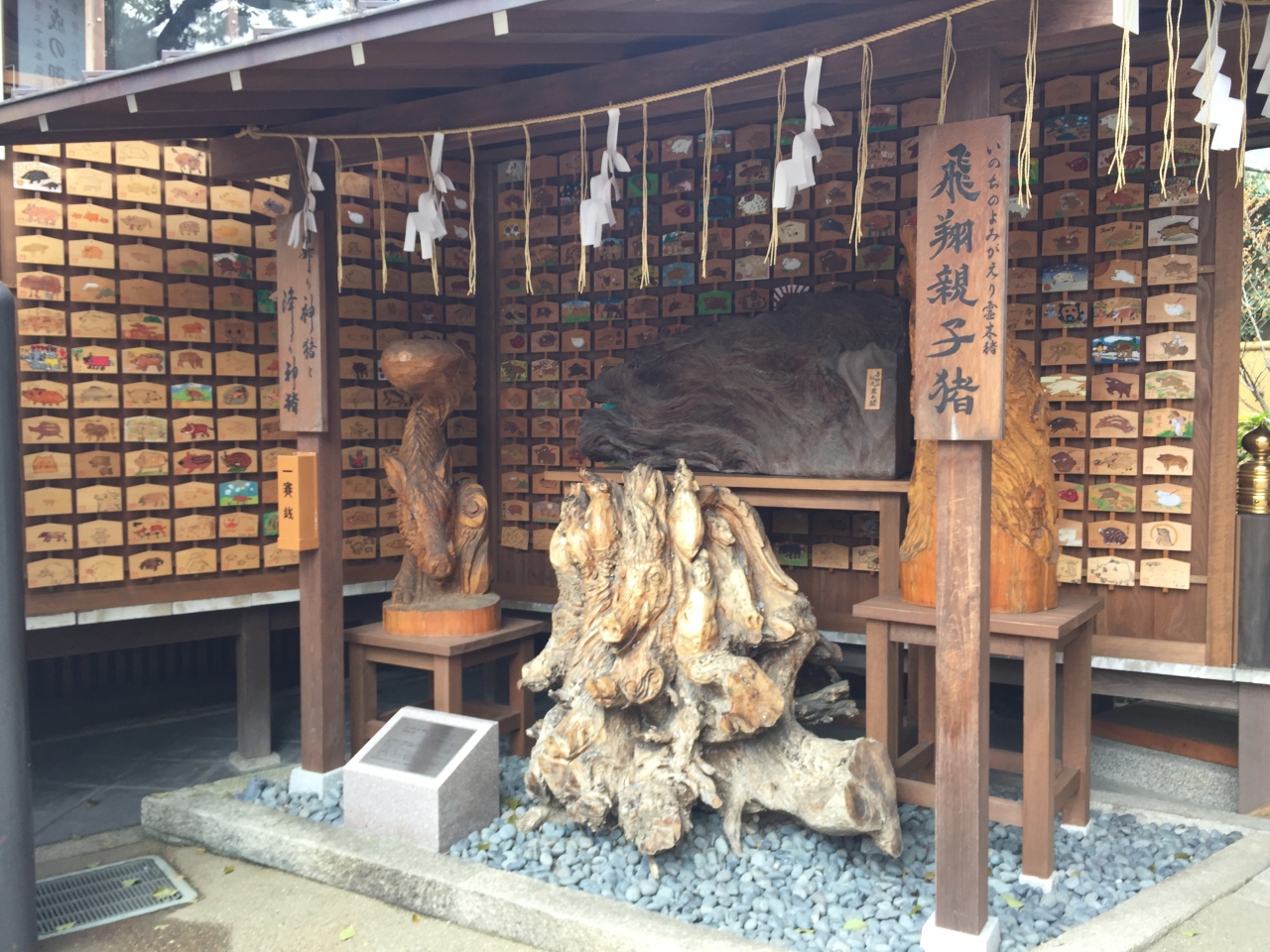 別名、いのしし神社というようです。境内のあちこちにいのししの像があり、狛犬の代わりにいのしし像が置かれていて新鮮でした。敷地の一角に飛翔親子猪と書かれた木彫りがありました。1つの木に沢山の猪が掘られた置物で、なんか怖かったです。いのししの由来は奈良時代にまでさかのぼるんだとか。