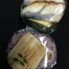 奈良名物の柿の葉寿司が多い中、変わり種のわさび葉ずしや奈良漬と穴子、古代米を使ったおにぎりのようなものもあるお店です。わさび葉ずしの上に柿の葉寿司と同じような鯖、鮭以外にも季節の魚などもあり、柿の葉寿司とのミニセットなどもありました。