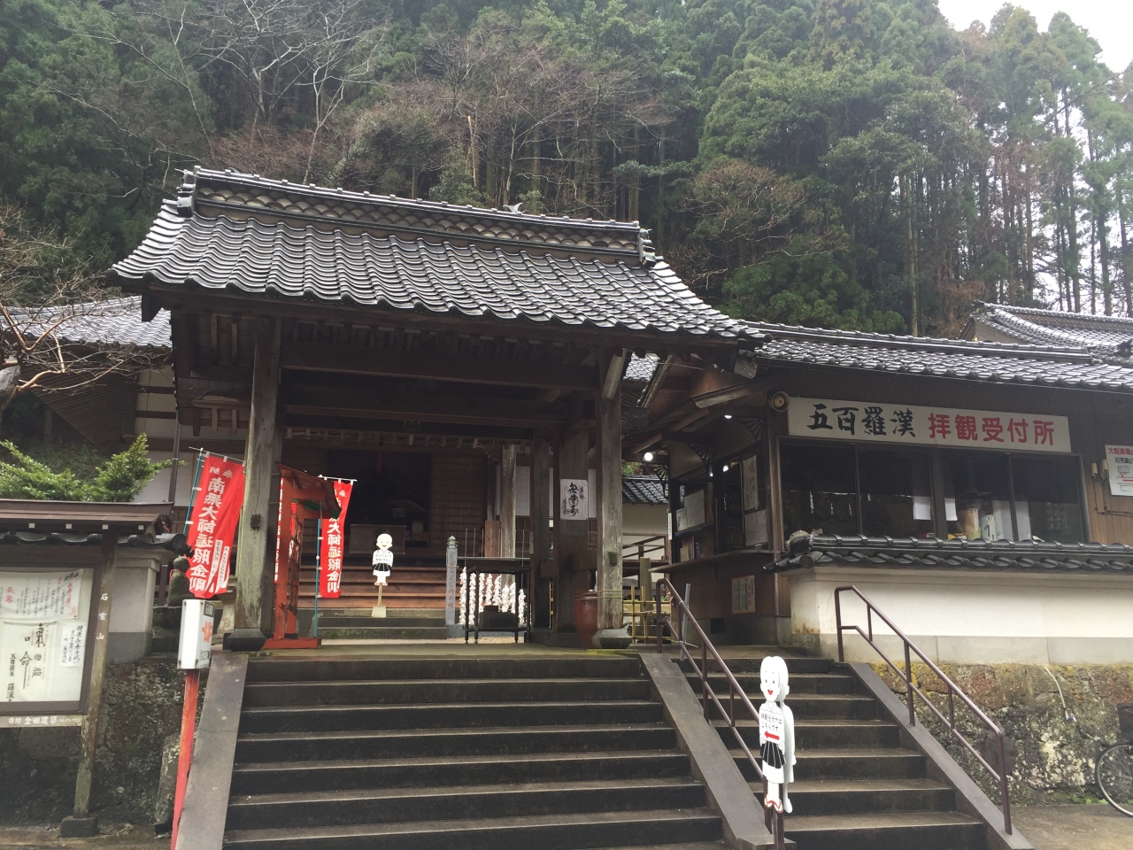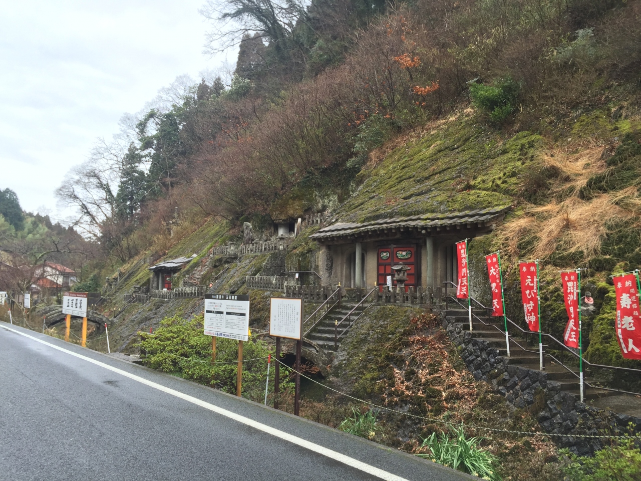 道路を挟んで片側にお堂、片側に五百羅漢像があります。丁度小雨が降っていて、どんよりした雰囲気の中訪問。手掘りの五百羅漢像は、(羅漢像と言っても人型の石に見える)だいぶ古ぼけていて、首がないものなどもありちょっと怖かった。ふとしたところに人型の石が置いてあるので、びっくりする。