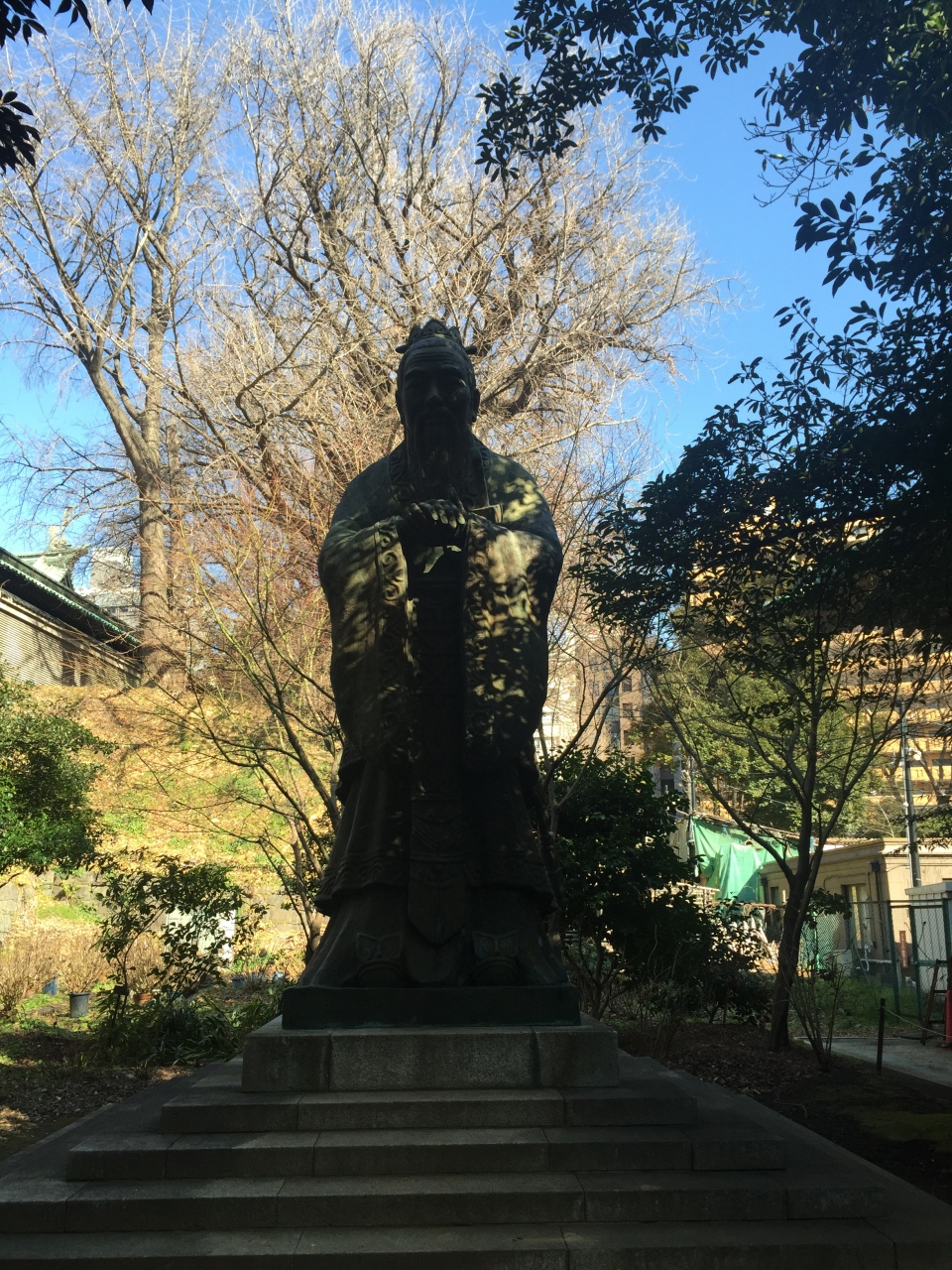 湯島聖堂に入る前に、大きな孔子像が目にとまります。逆光で顔が見づらかったけど、初老の風格のある銅像でした。中国風の服を着て中国の挨拶のポーズをとっていて徹底しているなと思ったら、台湾のライオンズクラブから寄贈されたものらしい。世界で一番大きな孔子像。大きかったです。