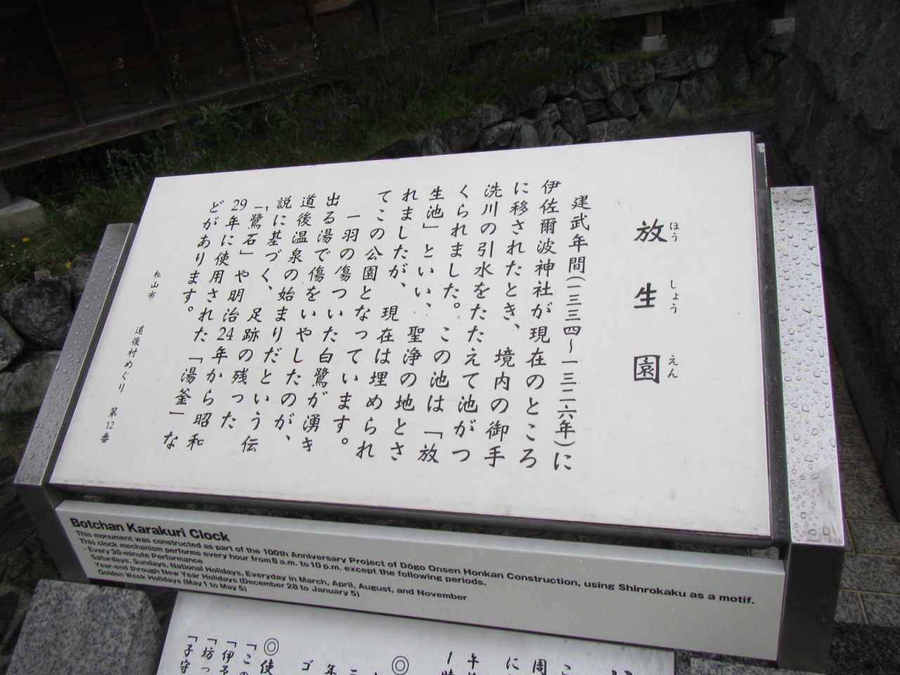 松山市電、道後温泉駅前にある広場で、昔は放生池という池があったと解説板に書かれていました。