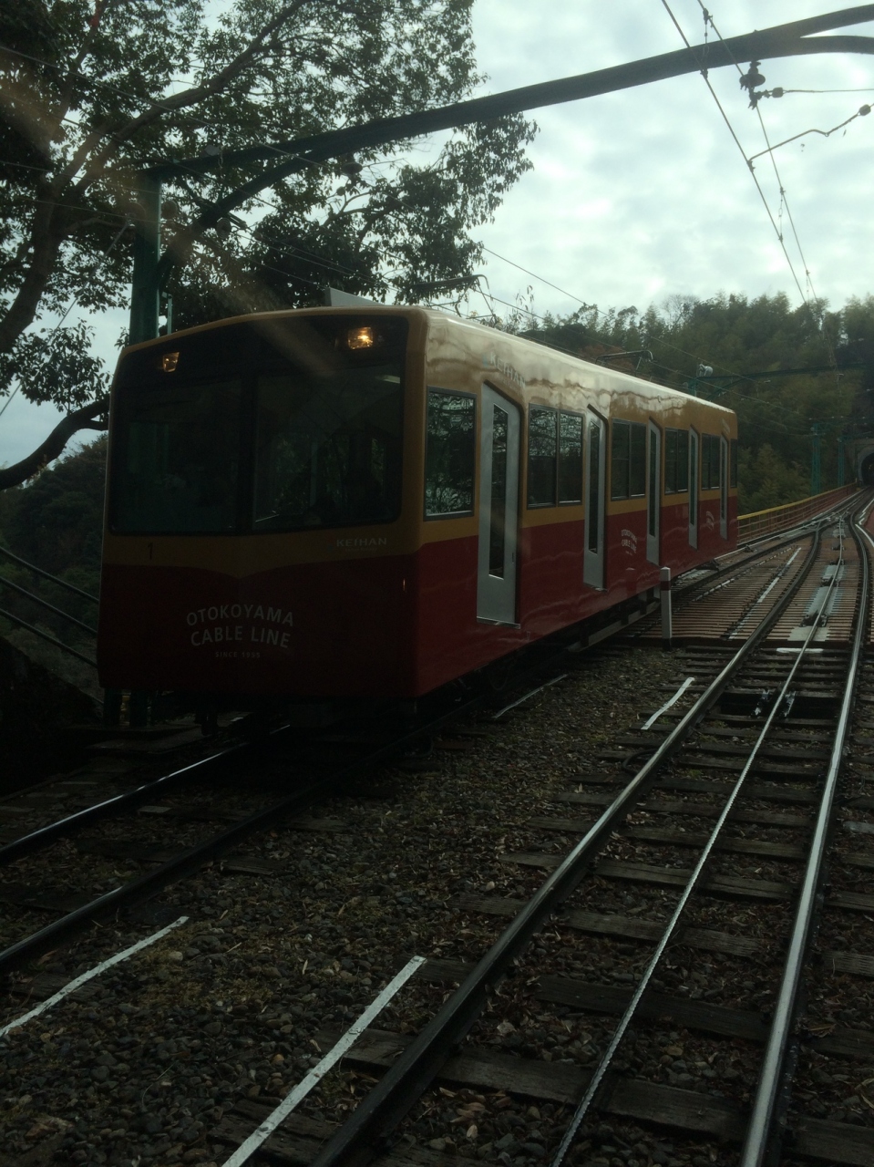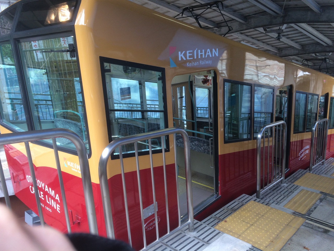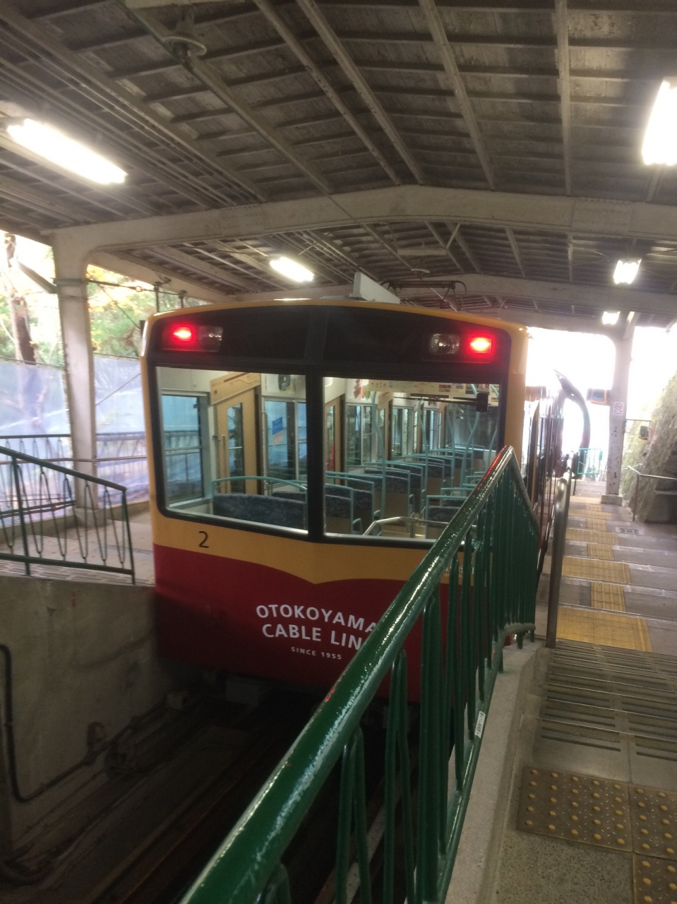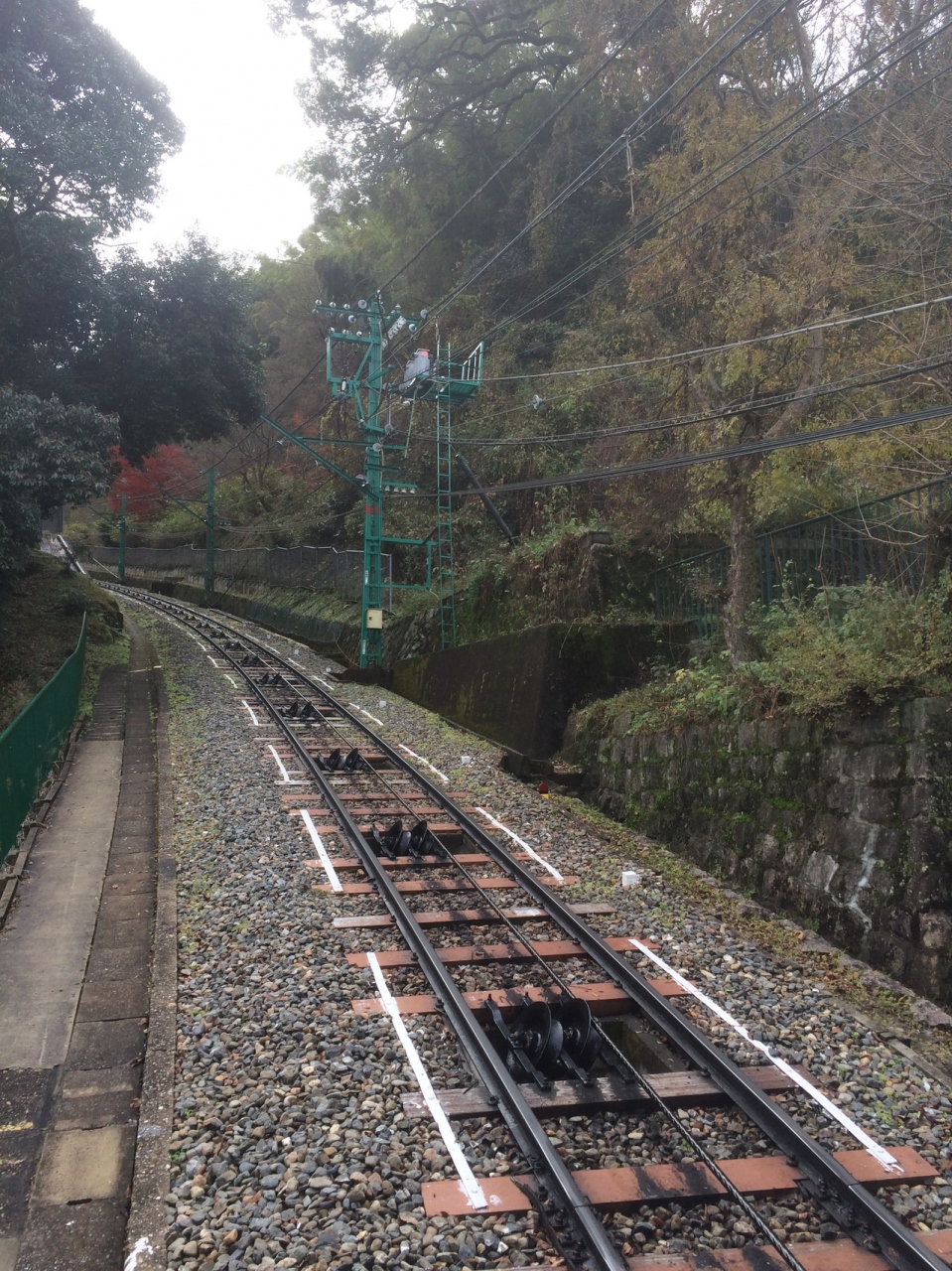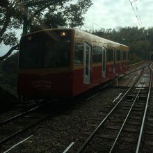 駅に止まっている列車が斜めになっていて、ホームも直線ではなく斜めで赤い列車です。単線で途中トンネルがあり、下り電車とかすれ違いました。林の中を抜けて行くので景色が楽しめる路線です。山頂の駅もホームが斜めでした。