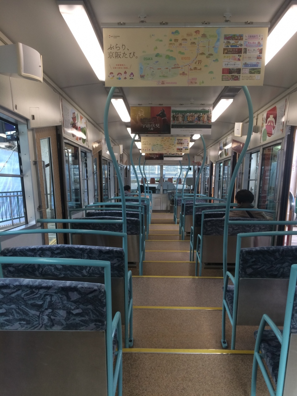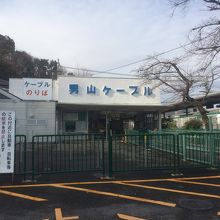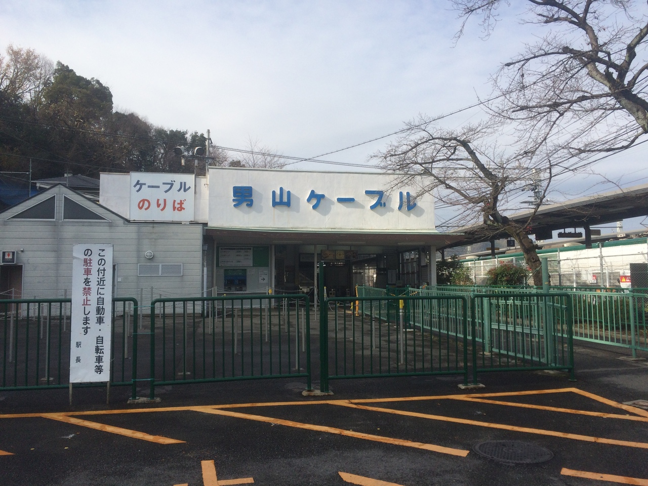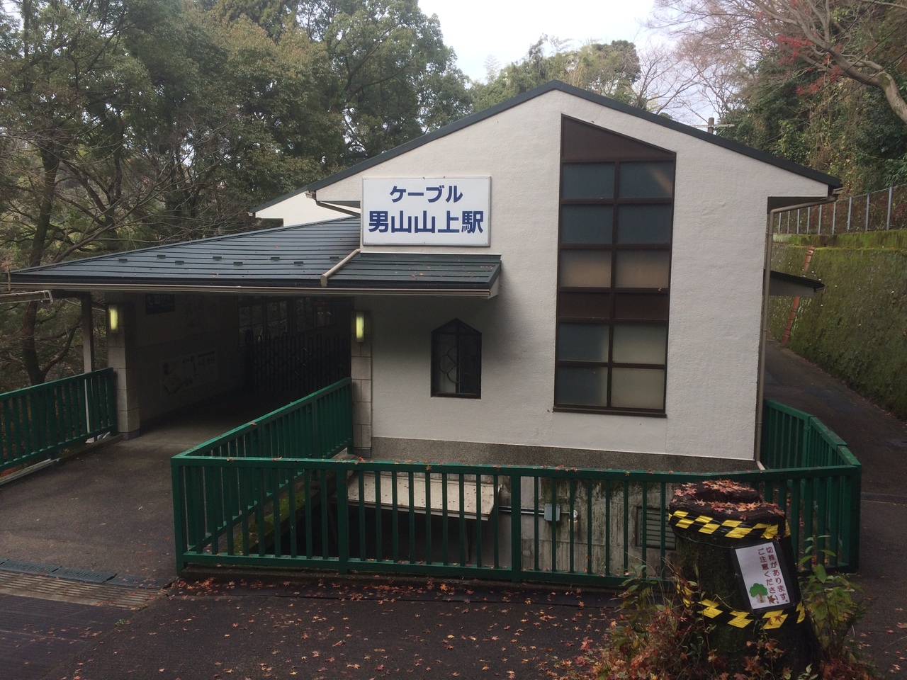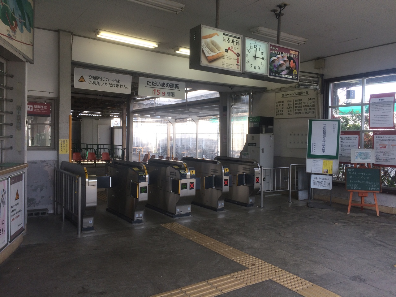 駅に止まっている列車が斜めになっていて、ホームも直線ではなく斜めで赤い列車です。単線で途中トンネルがあり、下り電車とかすれ違いました。林の中を抜けて行くので景色が楽しめる路線です。山頂の駅もホームが斜めでした。