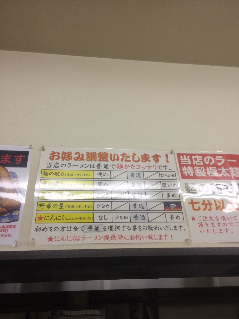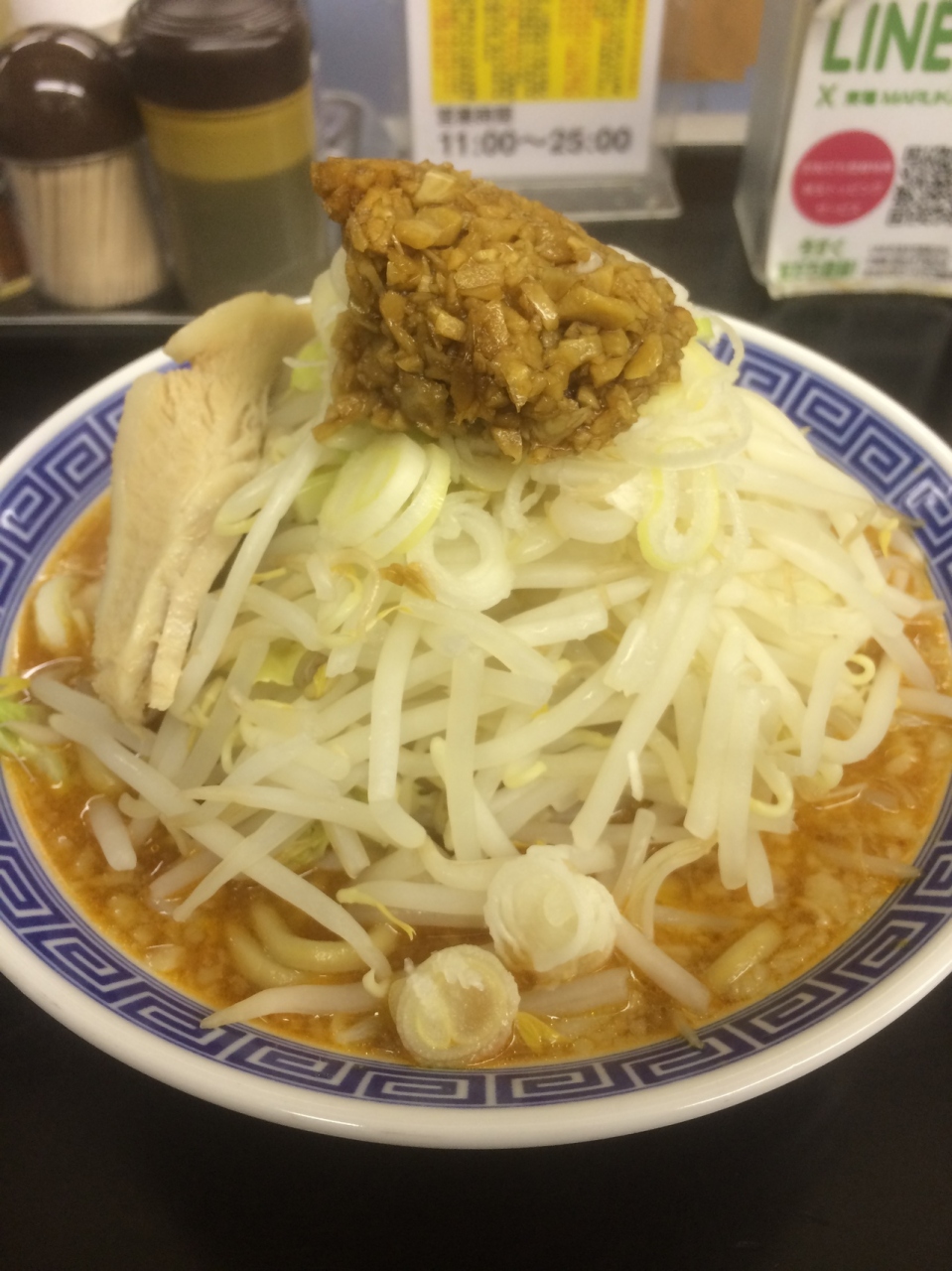 自動食券機で味噌ラーメンを購入し、カウンターに座りました。太麺のため、茹で時間に7分を要します。野菜が山盛りにのり、麺が隠れて出てきました。麺は太麺でスープは濃厚、ニンニクも入れたので少し胃がもたれた感じになりました。麺とスープの相性が良く美味かったです。チャーシューは1枚入っていました。