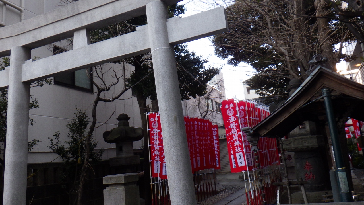 JR錦糸町駅北口から西へ北斎通り沿いをを400m沢山の赤いのぼりの建つ参道が印象的な津軽藩中屋敷の守護神として祀られた稲荷神社です。