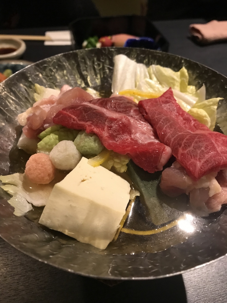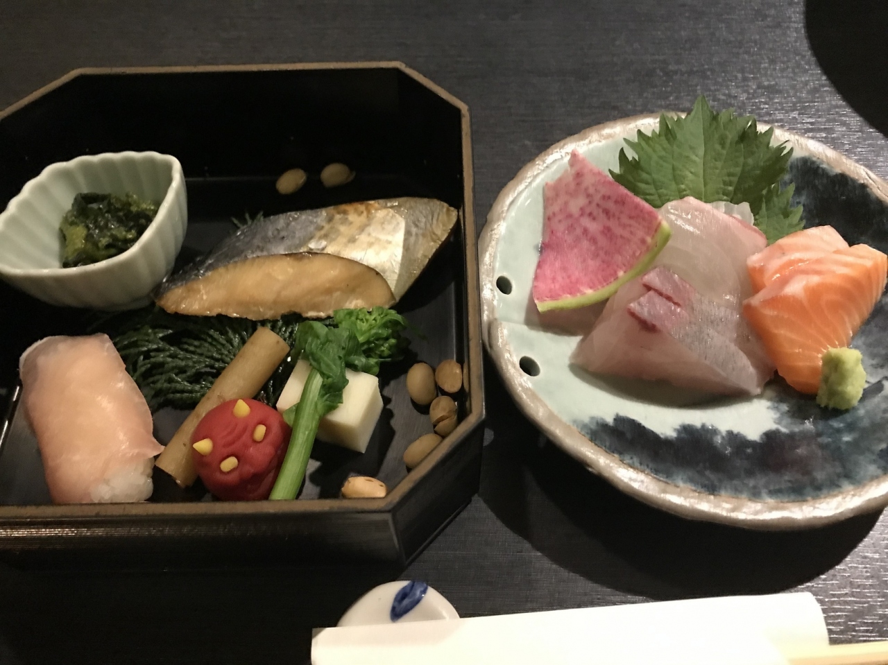 高槻駅近くのビルの5階です。5000円のコースを注文。節分らしい付き出しと、小鍋が出ました。小鍋の出汁は美味しいです。てんぷらと小鉢、最後には冷たい蕎麦がでました。料理は少ないです。高槻のどぶろくもあります。